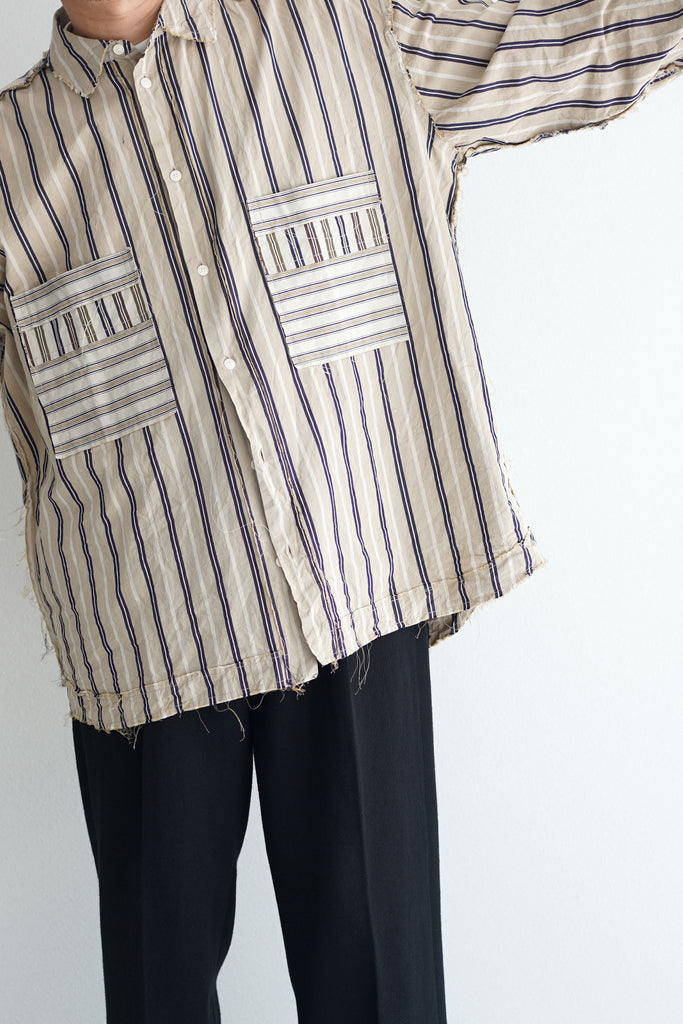 CASEY CASEYの中では特にゆったりとしたシャツ。身幅の大きさ、ドロップショルダーなどオーバーサイズンのシルエットはシャツが主役になるコーディネートを組むことが出来ます。今シーズンはCASEY CASEYでは珍しいストライプ柄での提案。CASEY CASEYのサスティナブルの観点から、過去に使用して残っていた生地を掛け合わせて、パッチワークのシャツに仕上げました。胸ポケットの生地を変えることでインパクトがあり、目を引くシャツに魅力を感じています。