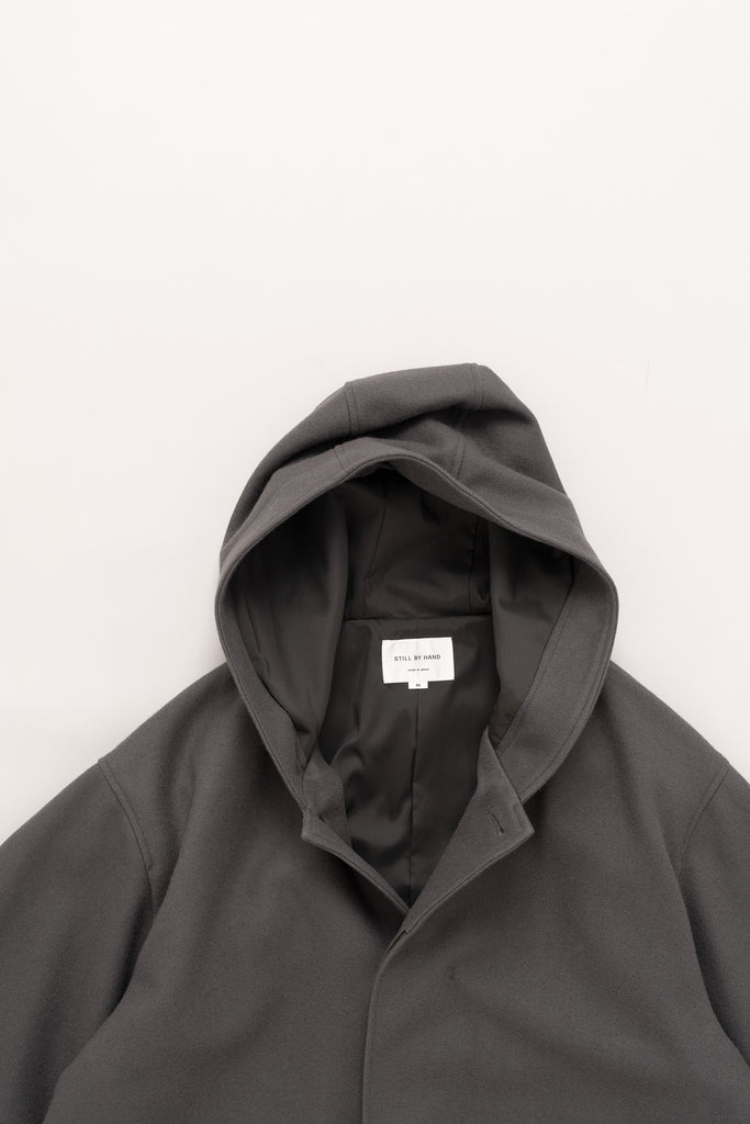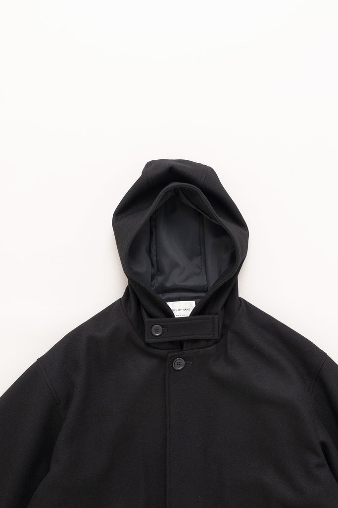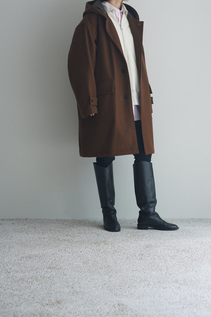 ラムウール原料のメルトンを織った後に更に縮絨し、フェルト化した表情が特徴のフードコートです。