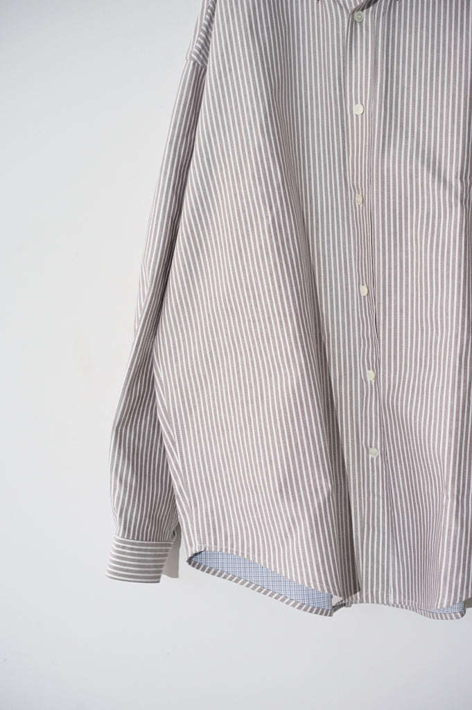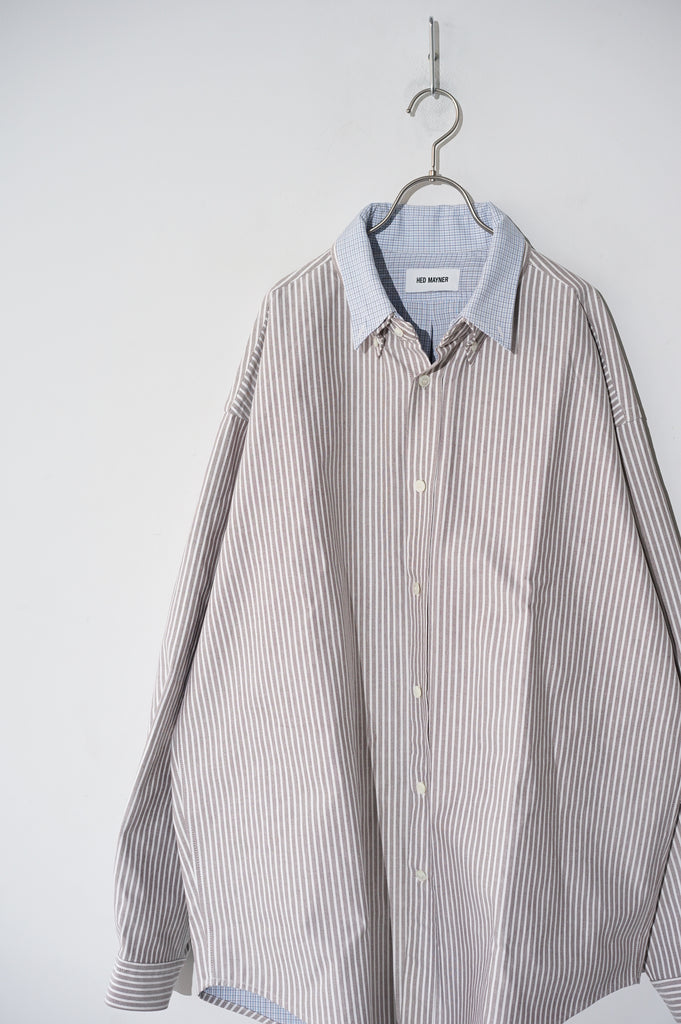 様々な着こなしが出来て、キャットウォークショーでも最も目立っていたアイテムでした。2枚のシャツをドッキングしているのでボンディング加工のような張り感があり、着た時のシルエットも特徴です。