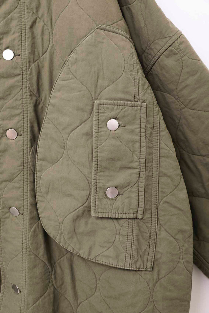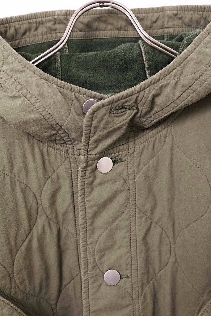 コットンパラフィン加工 / 中綿 / ヘビーネルがキルティングにより3層構造になっているISSUETHINGSオリジナルの生地を使ったフード付きコート。