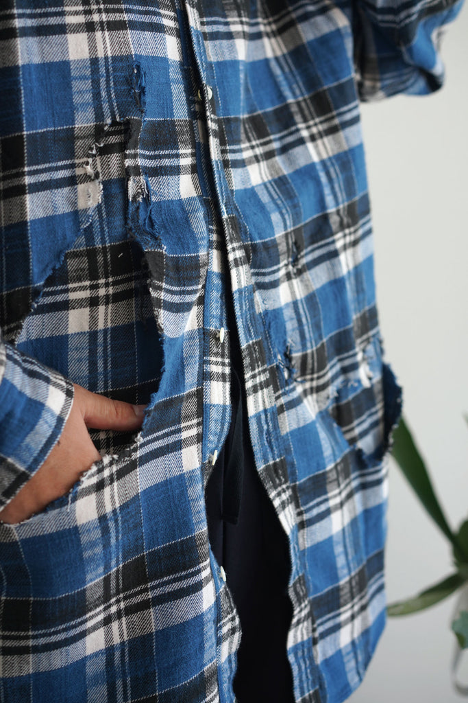 前身頃の一番上の層にのみ手作業でダメージ加工を施し、
