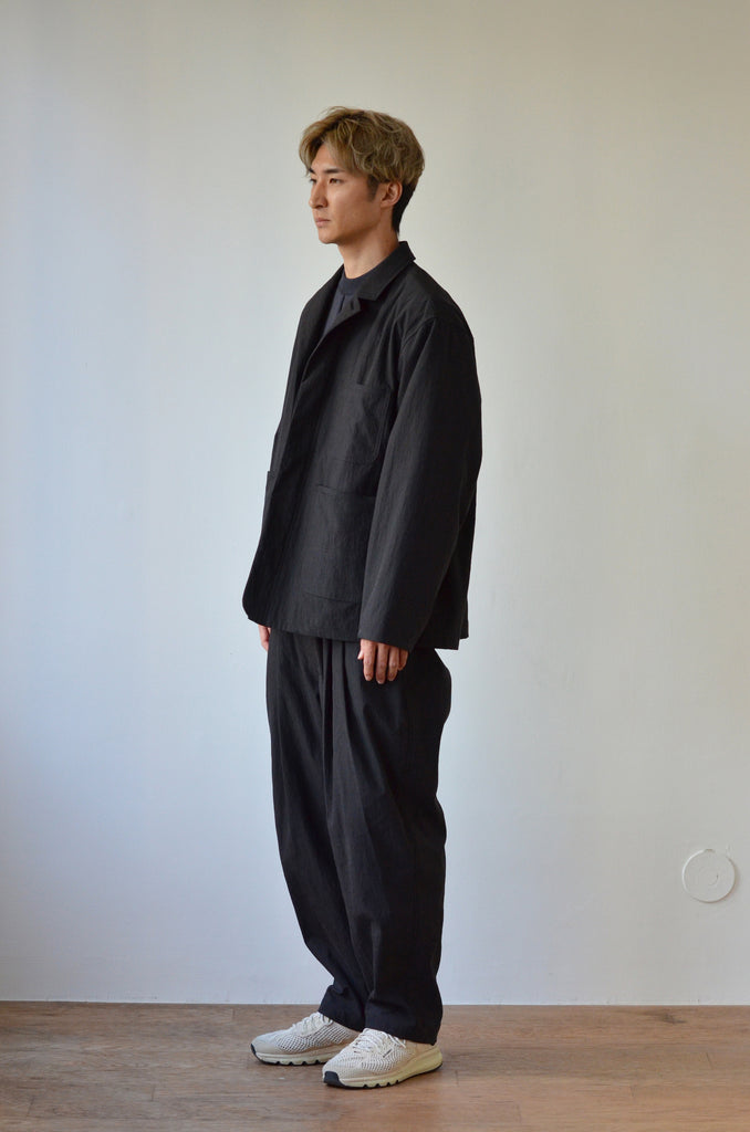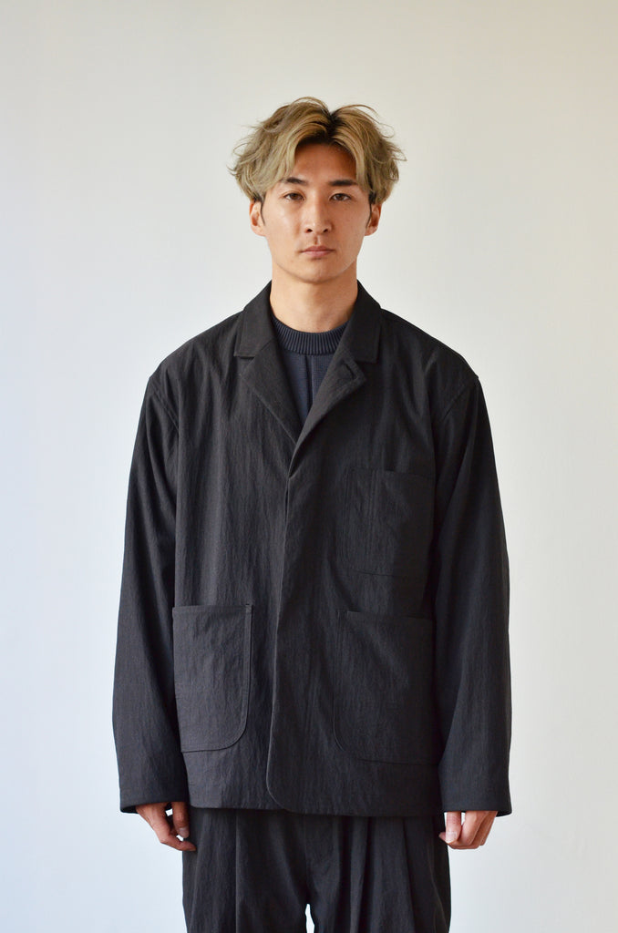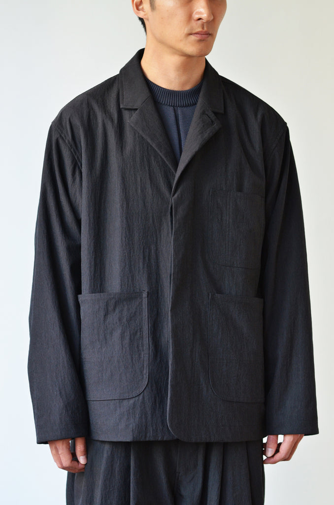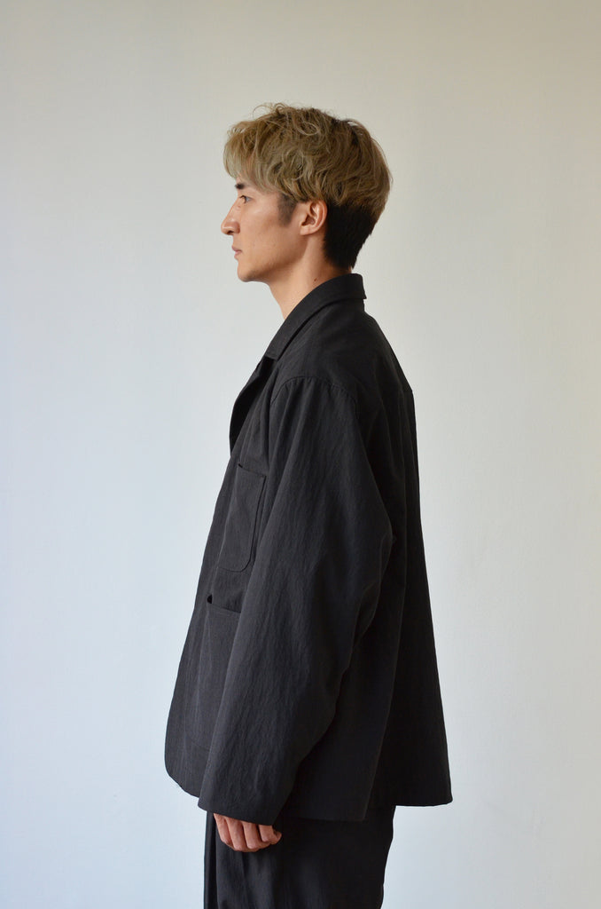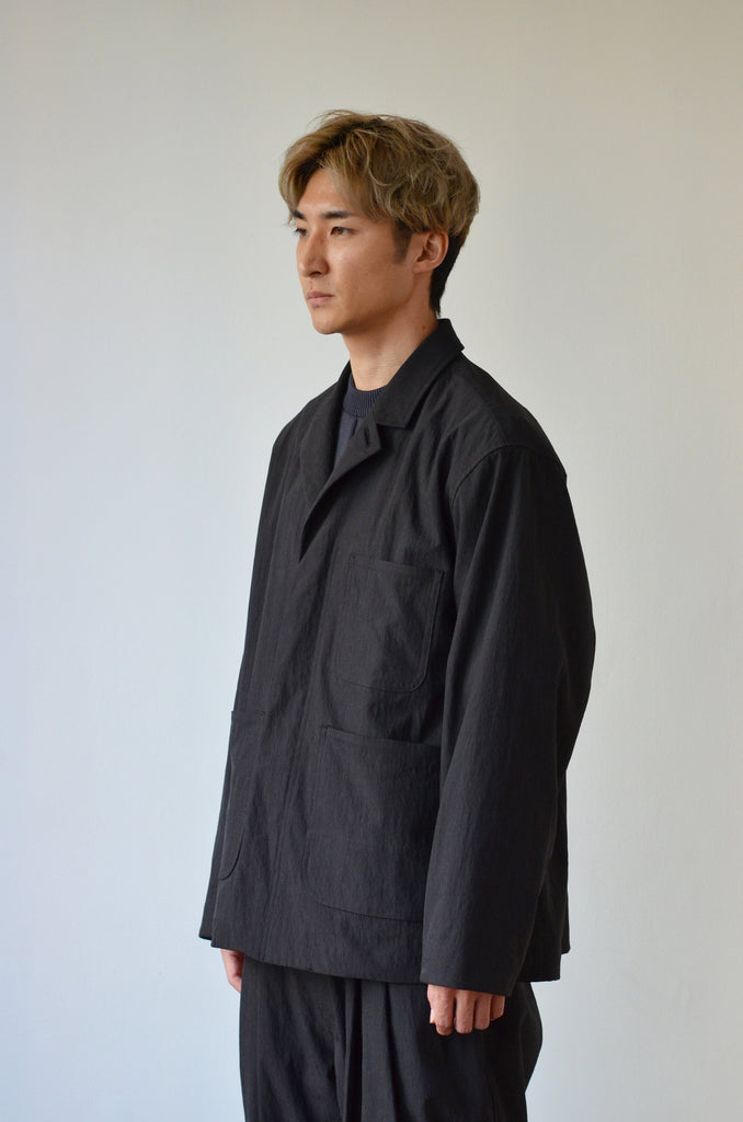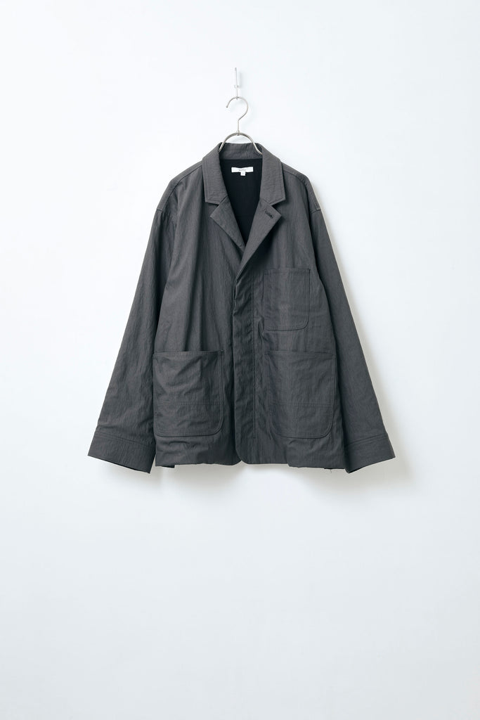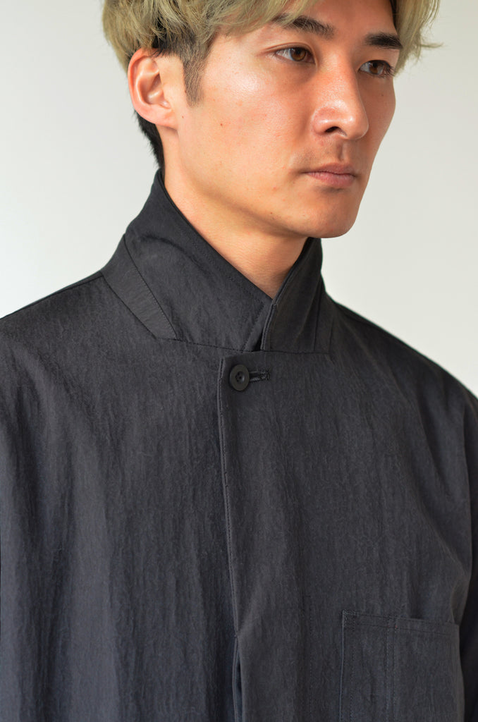 象徴的なワークウェアの素材と比較して、より現代的な雰囲気を作り出すためにナイロンを使用したカバーオールジャケットです。