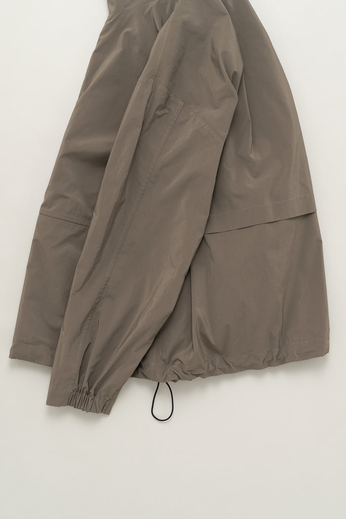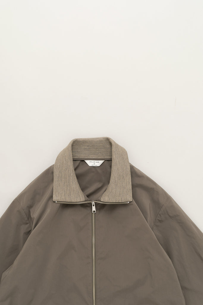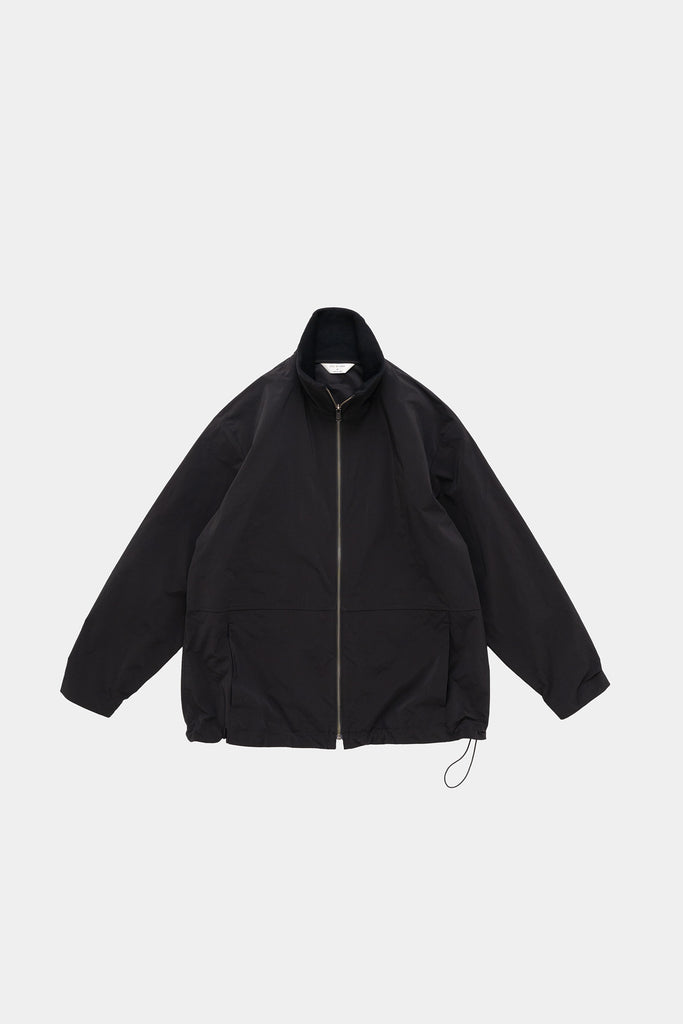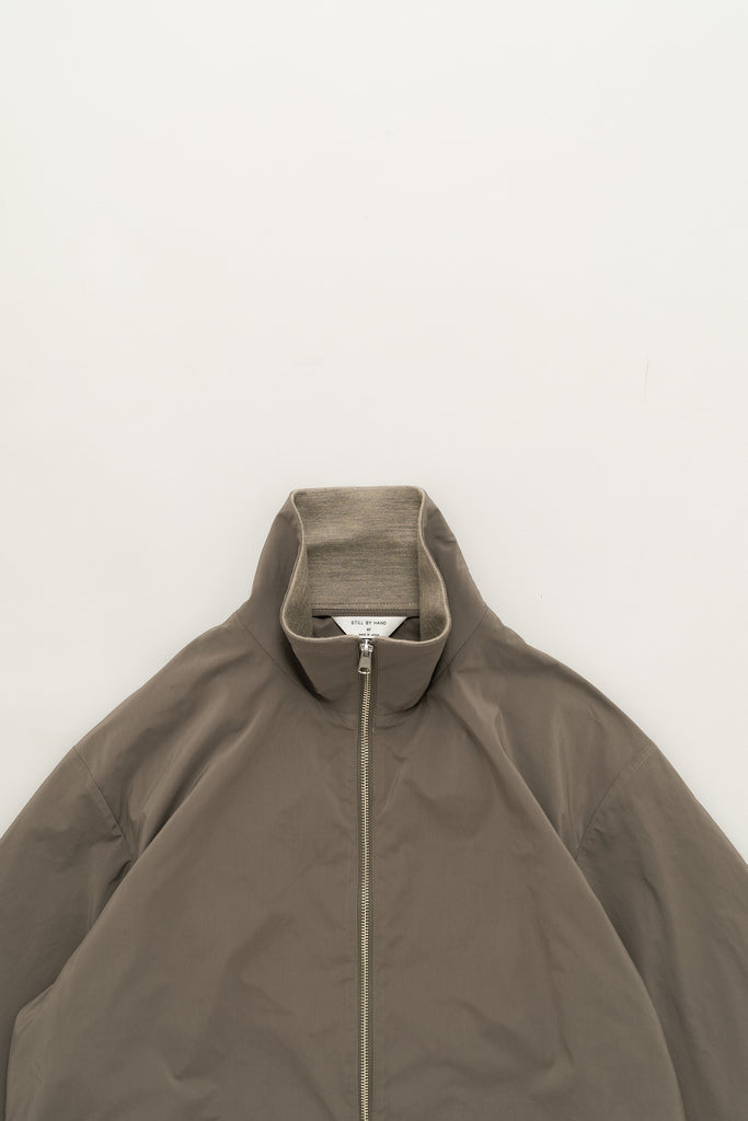 ポリエステル/ナイロンの特殊糸を使用した素材のミドルレイヤーにも使えるハイネックブルゾン。