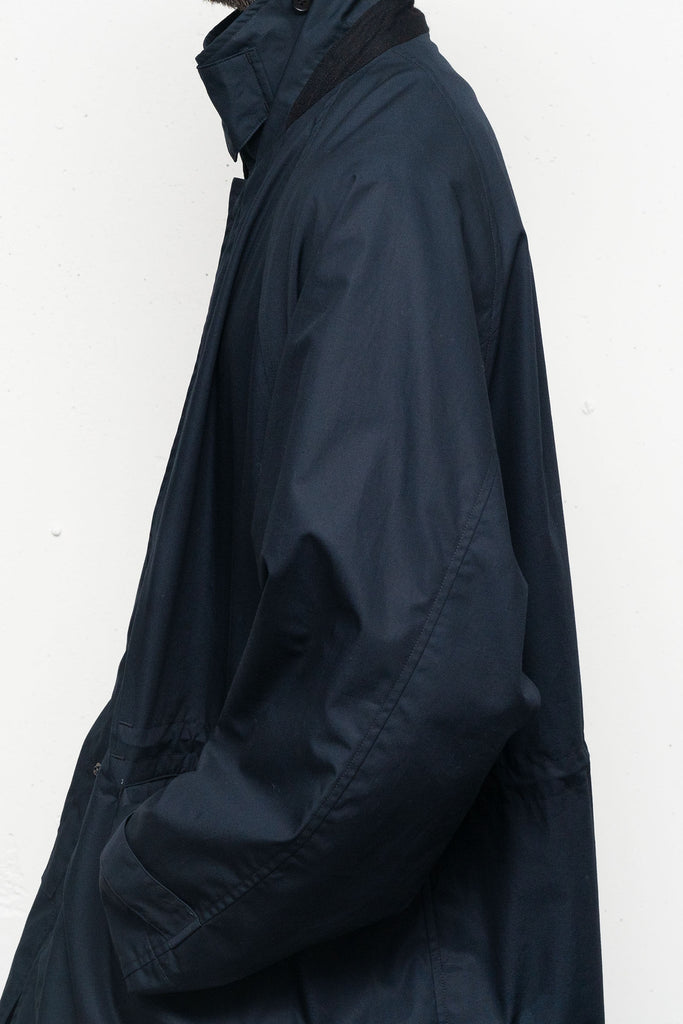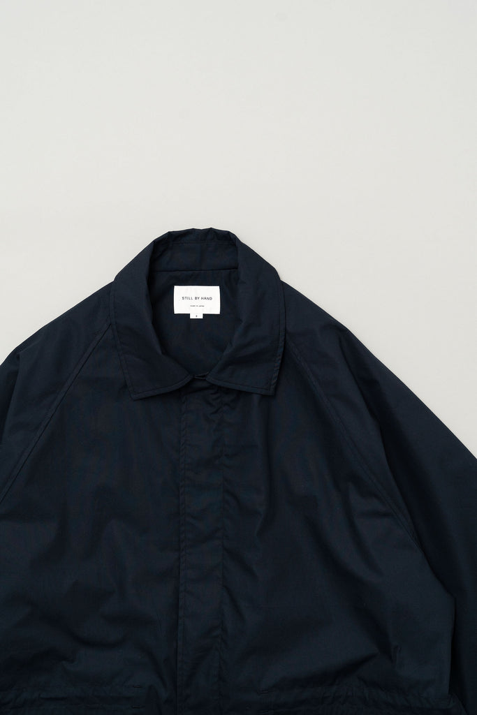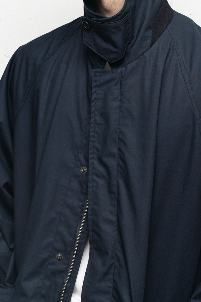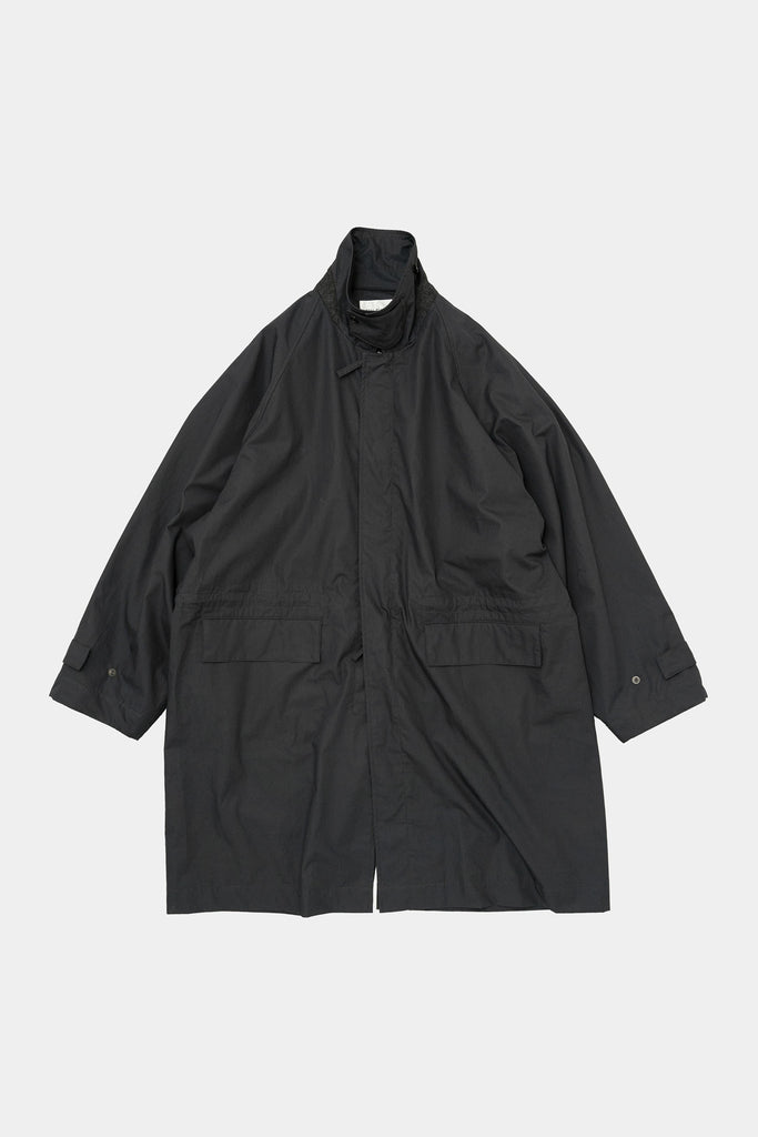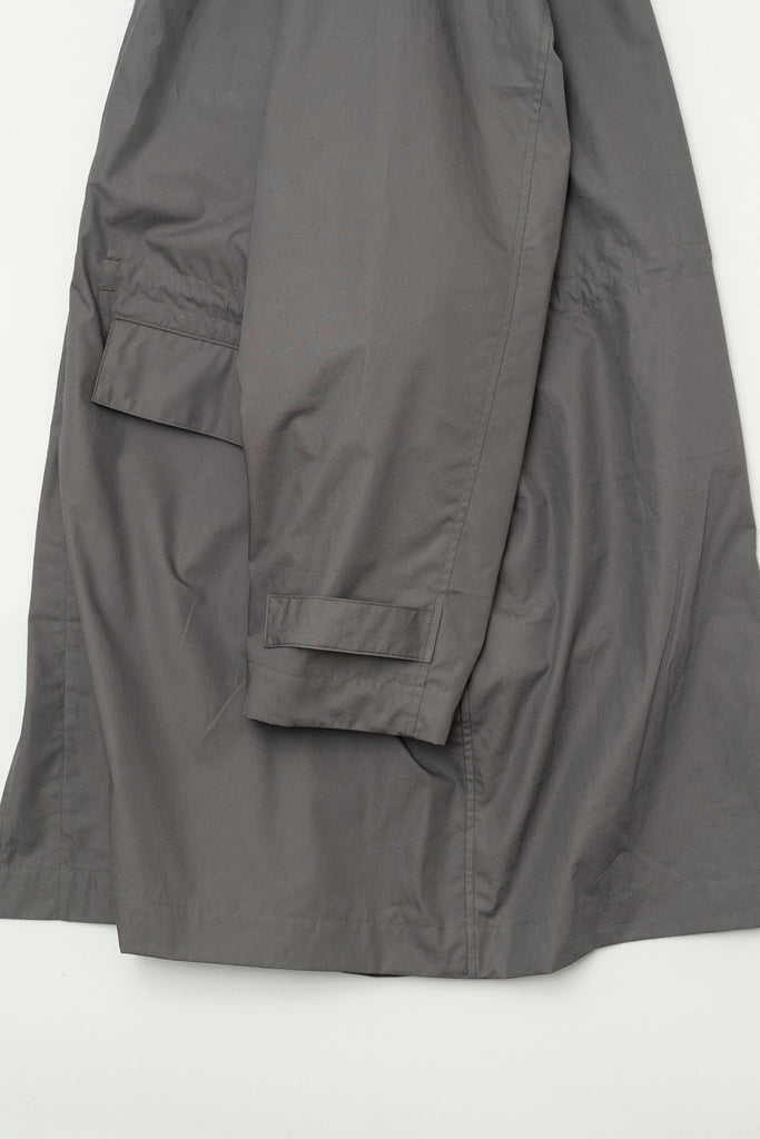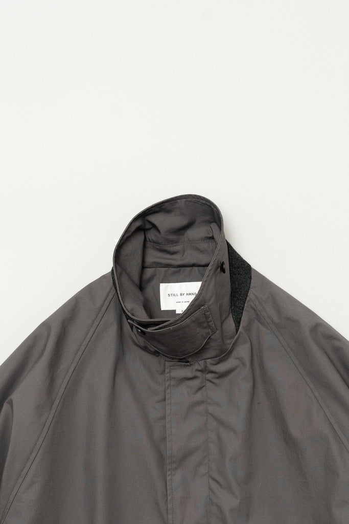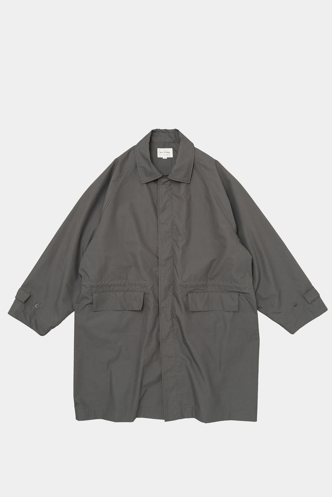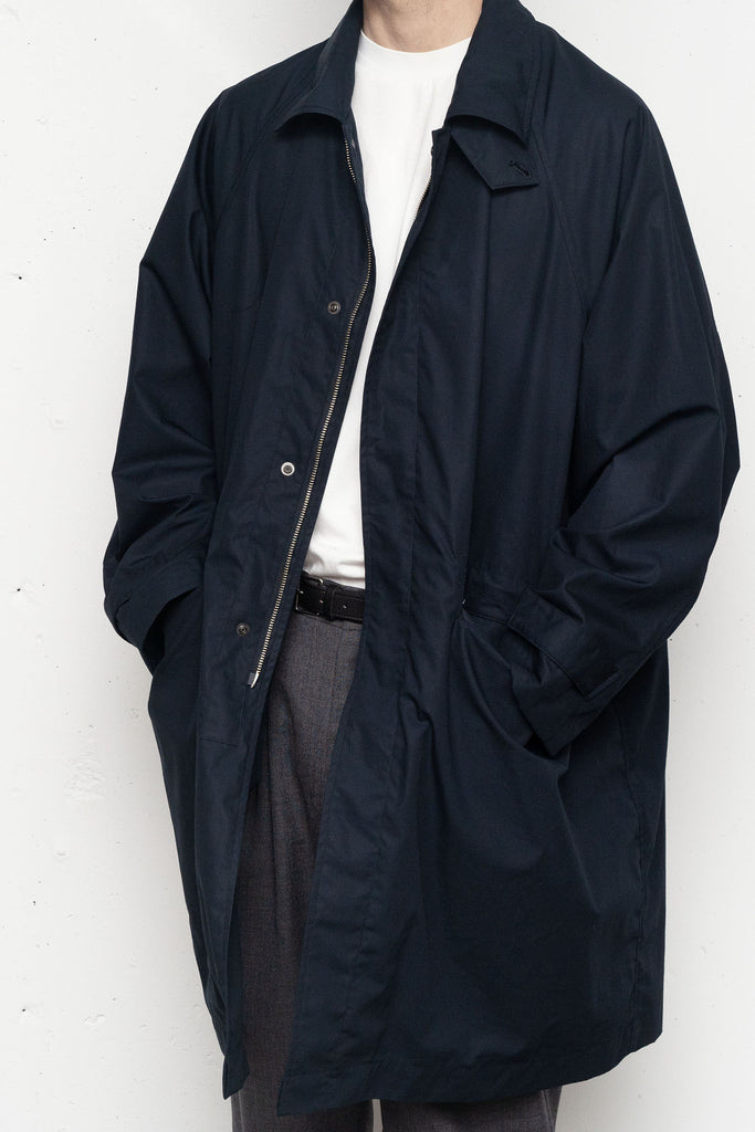 オリジナルカラーで染色したウェザー素材に撥水加工を加え、ステンカラーコートを製作。