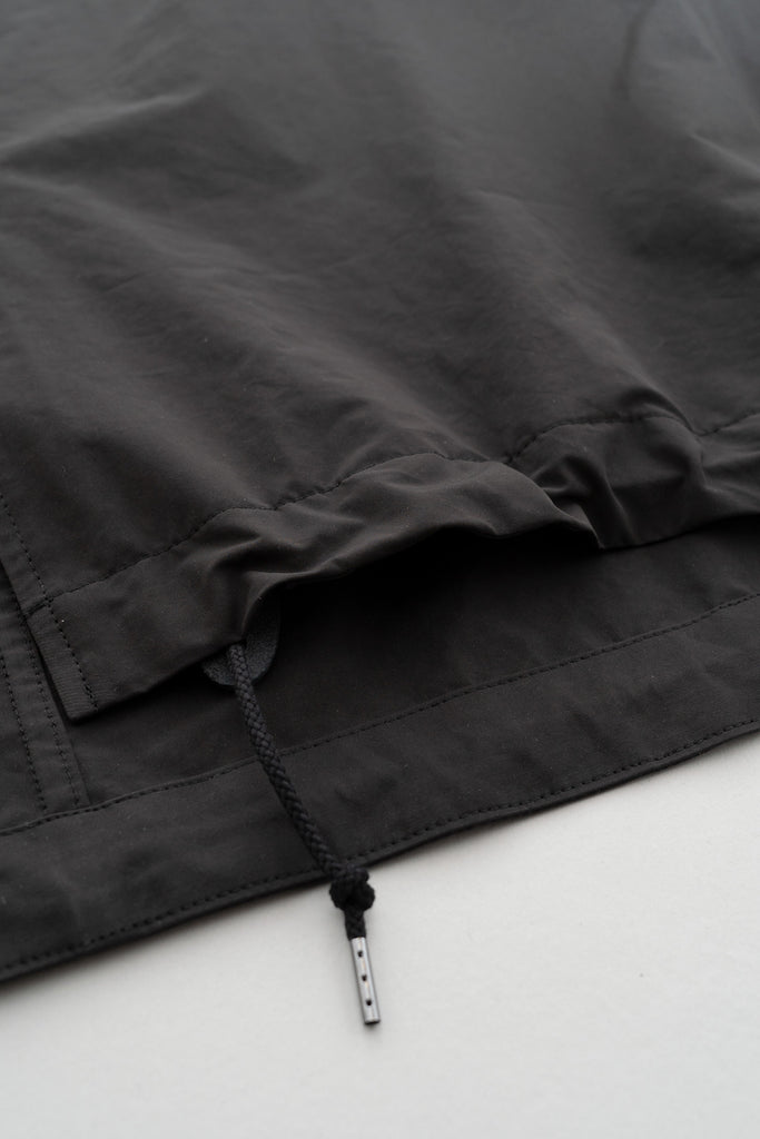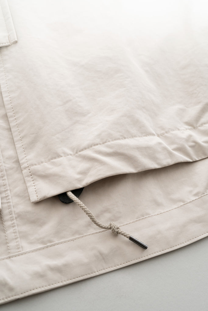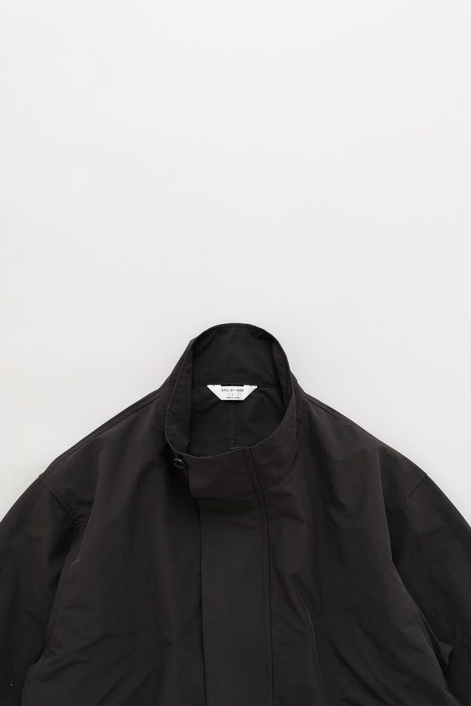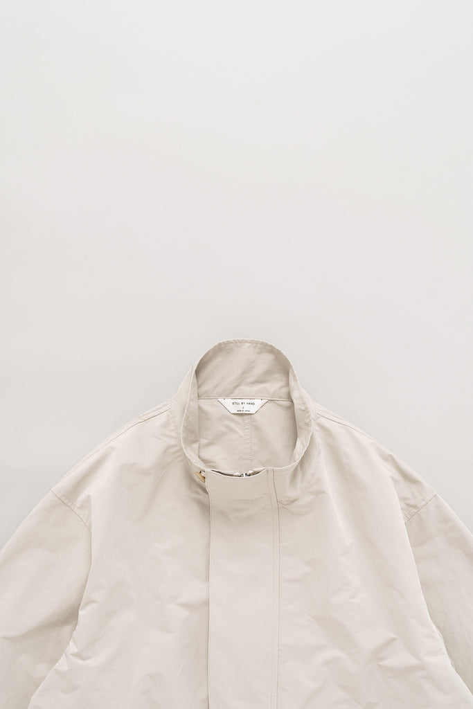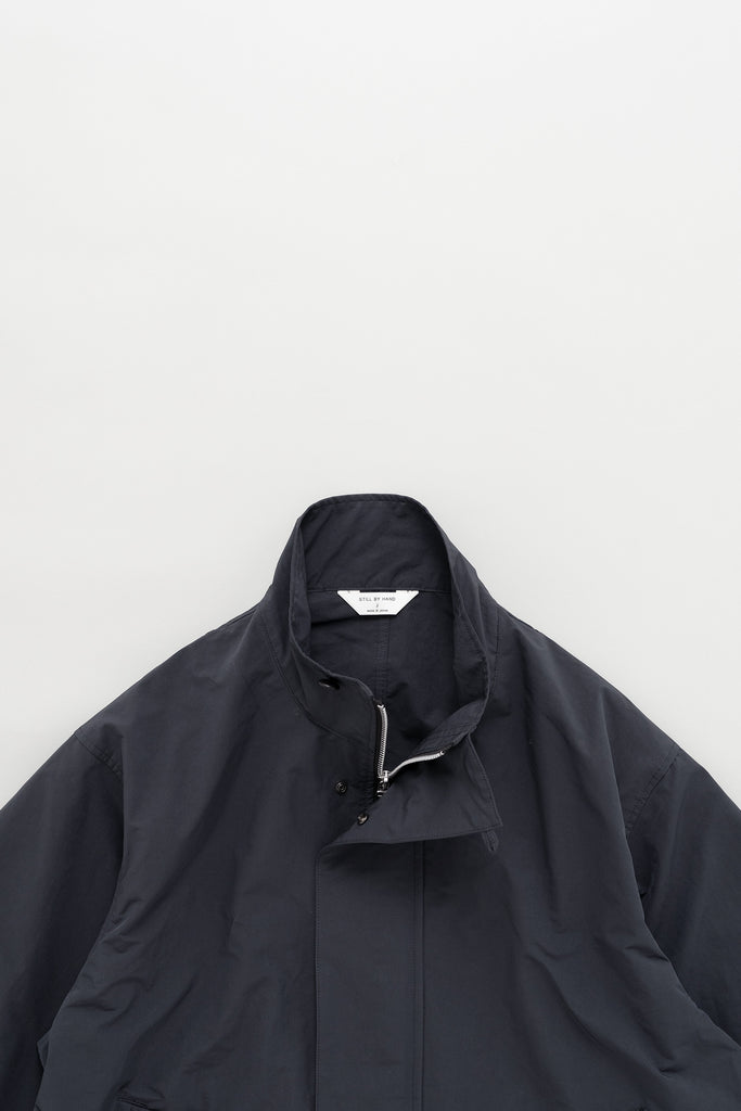 ポリエステルとナイロンの割繊糸の平織素材を使用したスタンドカラーコートを作成しました。