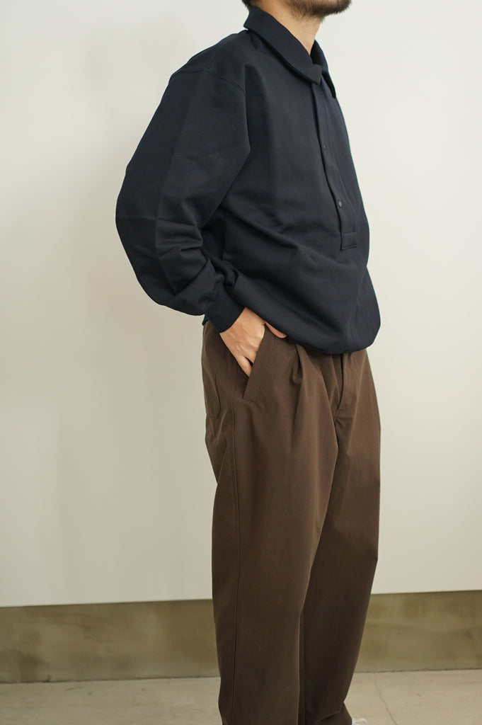 毛羽が少ないコンパクト糸をハイゲージで編んだ裏毛素材のポケット付きプルオーバー。