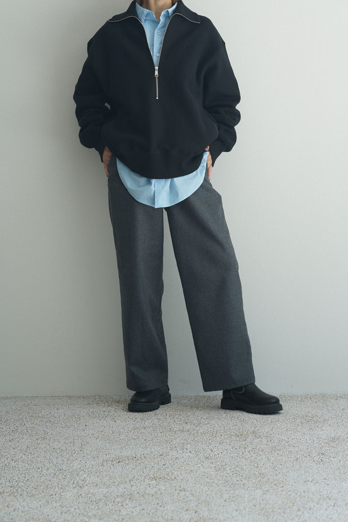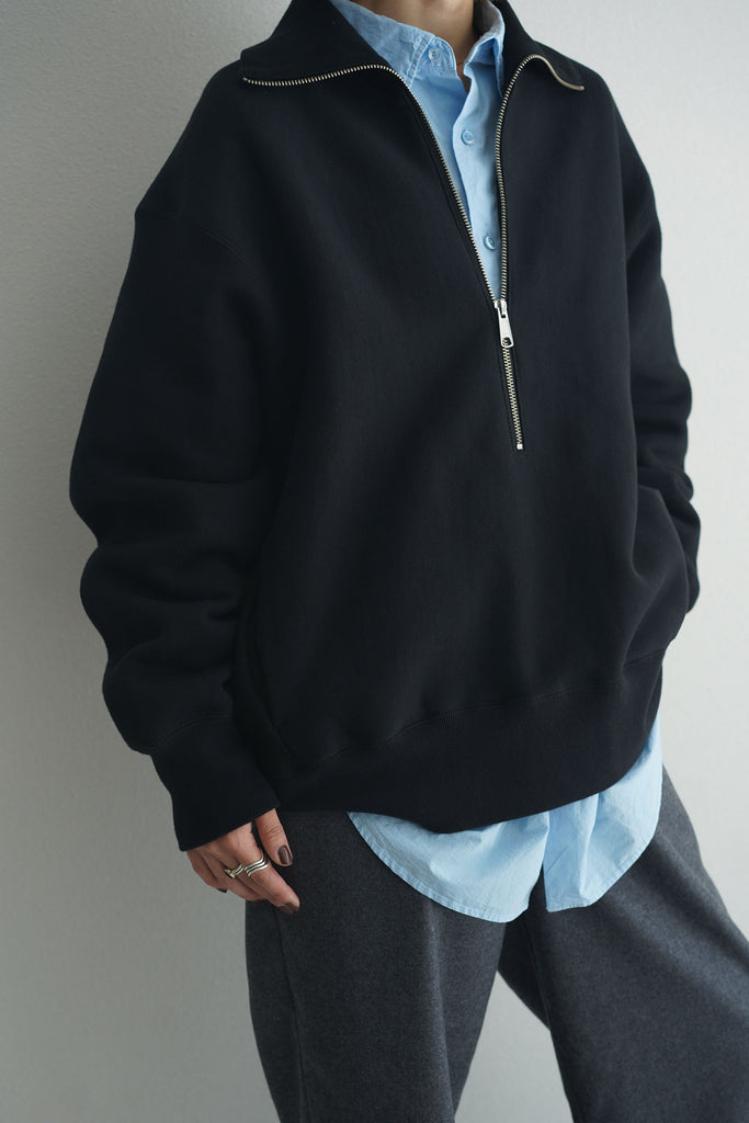 膨らみのあるヘビーウェイトな裏起毛素材を使用し、ハーフジップのプルオーバースウェットを作成しました。