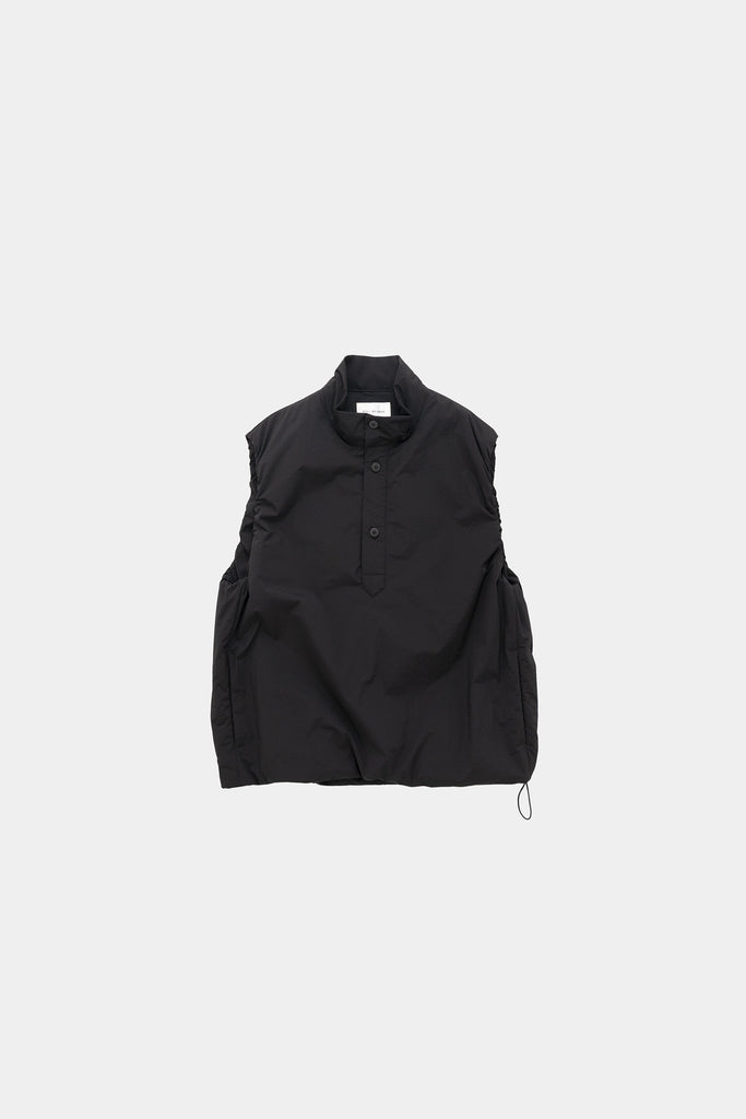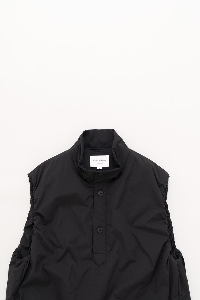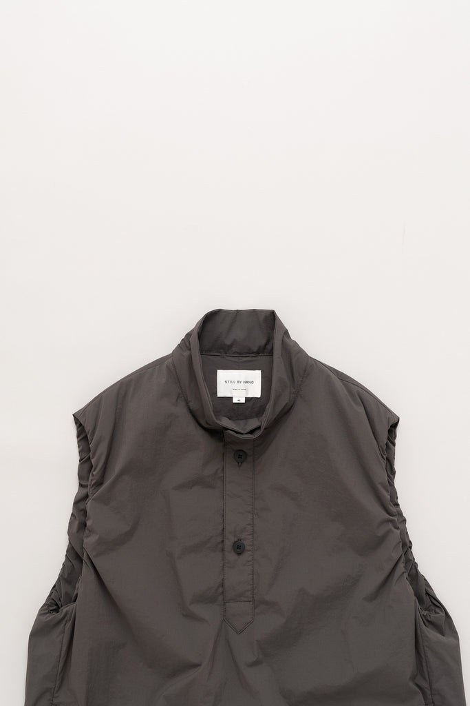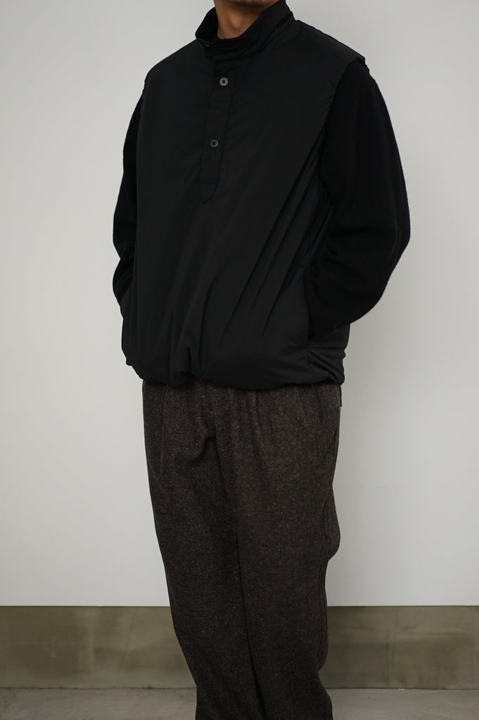撥水性がありながら天然素材のような見た目のナイロン素材でシンサレート入りプルオーバーベストを作成。