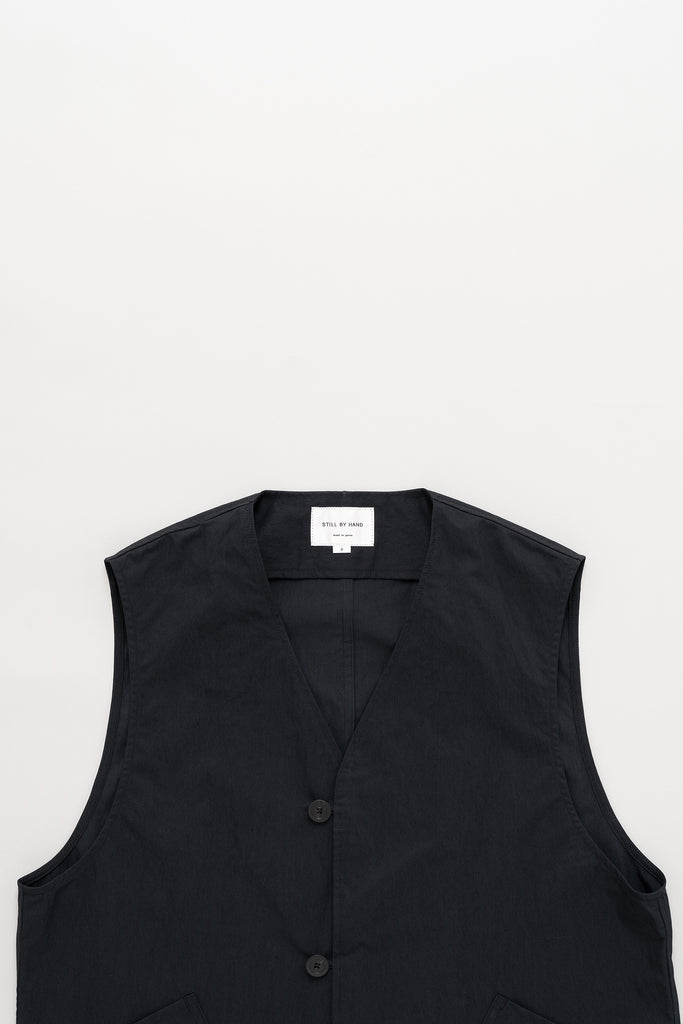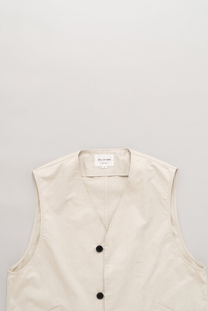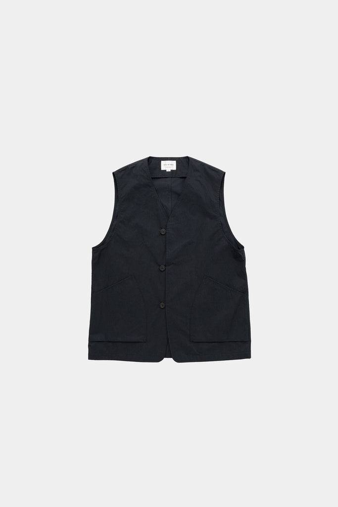 コットン/ナイロンを高密度に織ったツイル素材にワッシャー加工を施した独特なタッチが特徴の生地でベストを作成。