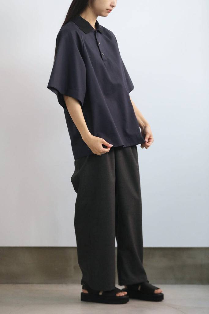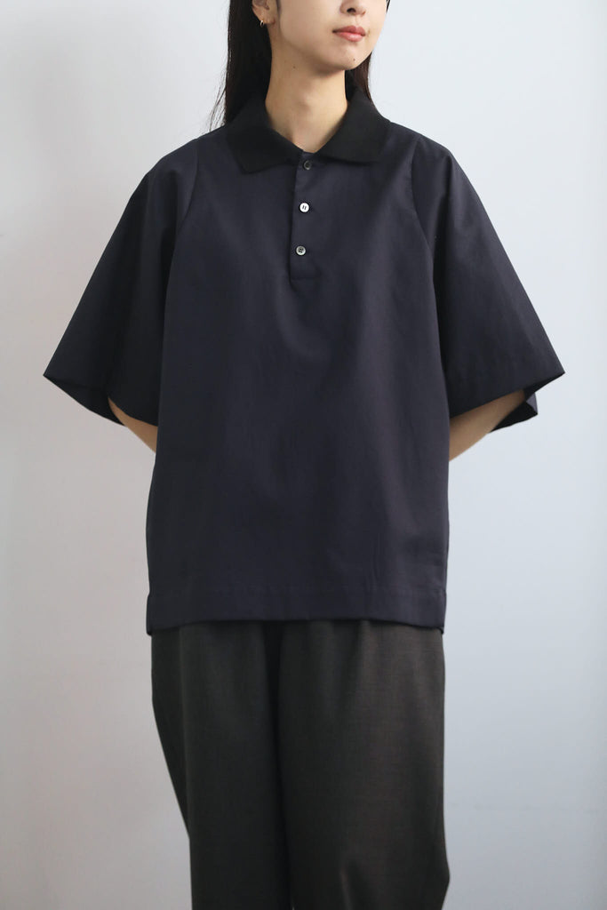 SIRO糸X200/2番手により、糸自体に光沢感があり且つ毛羽立ちにくい特徴があり、又ウレタンの加工により伸縮性があります。肩幅を小さくアームホールを大きく風通しの良いプルオーバーです。