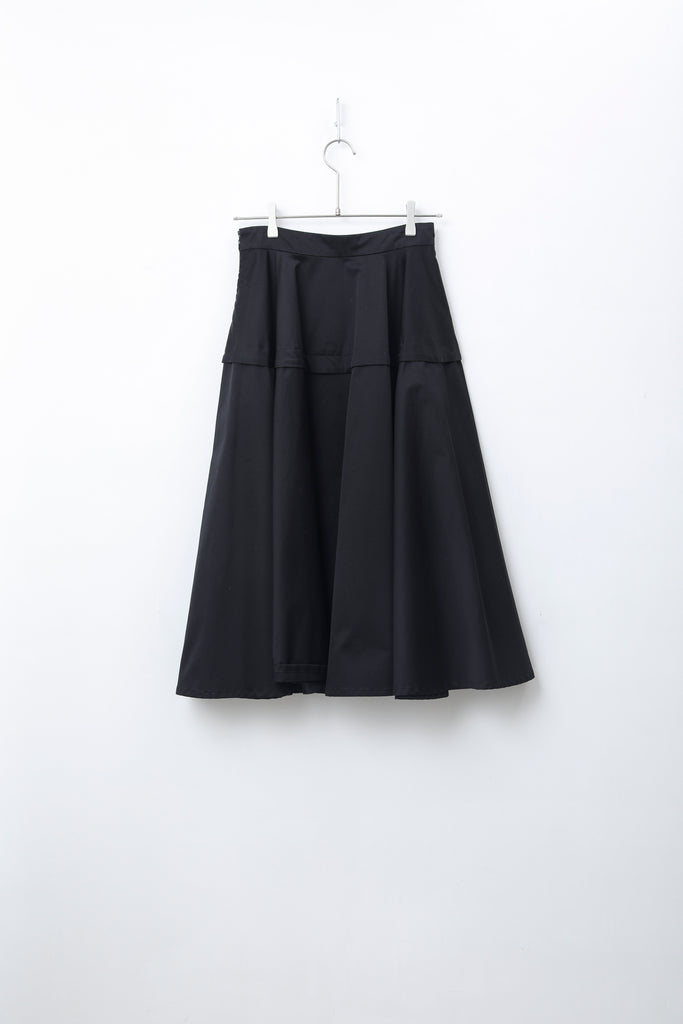 最高級のスーピマコットンを使用し、限界まで高密度にして朱子織で織り上げた素材。糸本来の光沢感に加えて、サテンの艶、さらには仕上げ工程でシルケット加工を施すことによってシルクのような美しい光沢や風合いを生み出しています。ヨーク切替の360度フレアスカート。