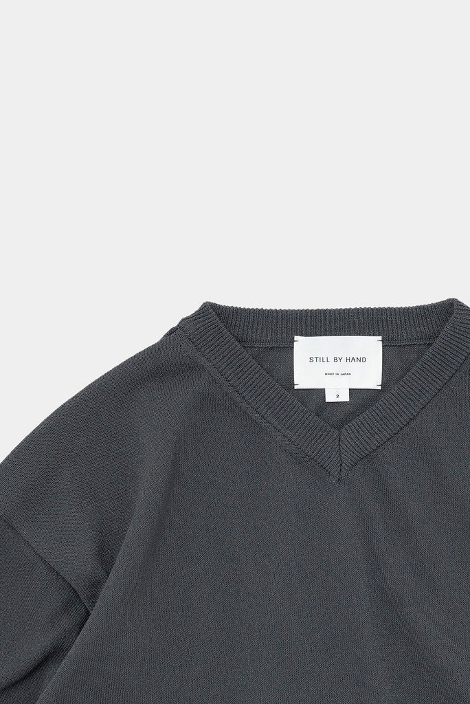 コットンとポリエステルを撚糸+強燃化工した糸を使用し12Gの浅いVネックプルオーバーを作製。