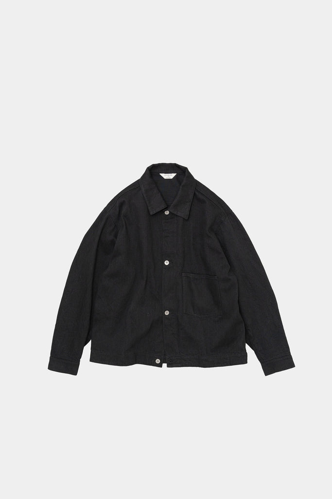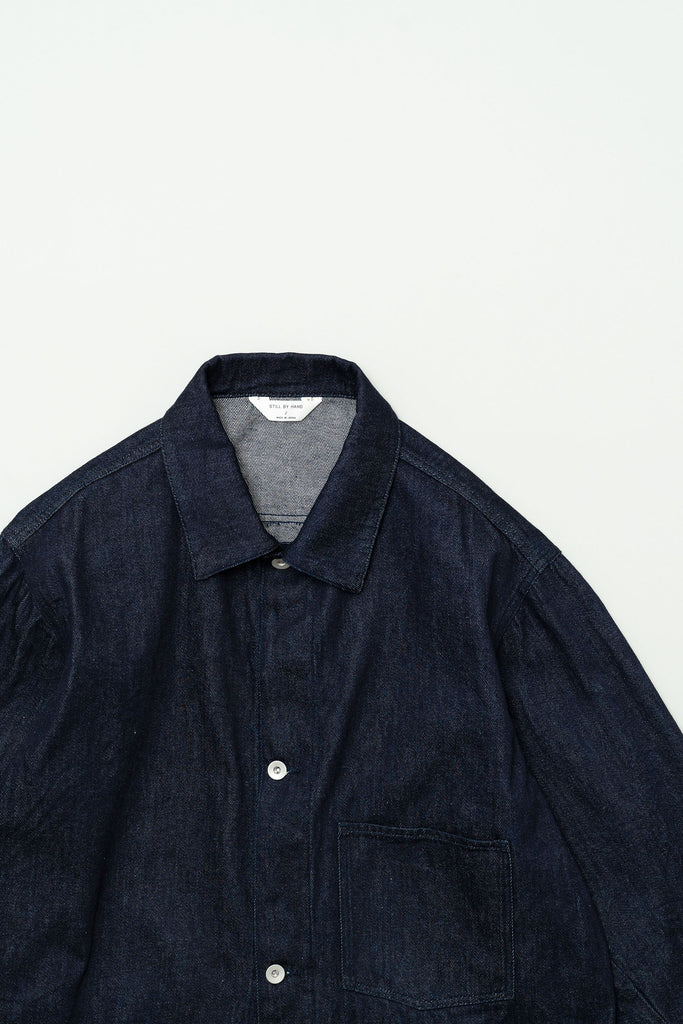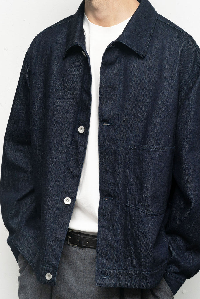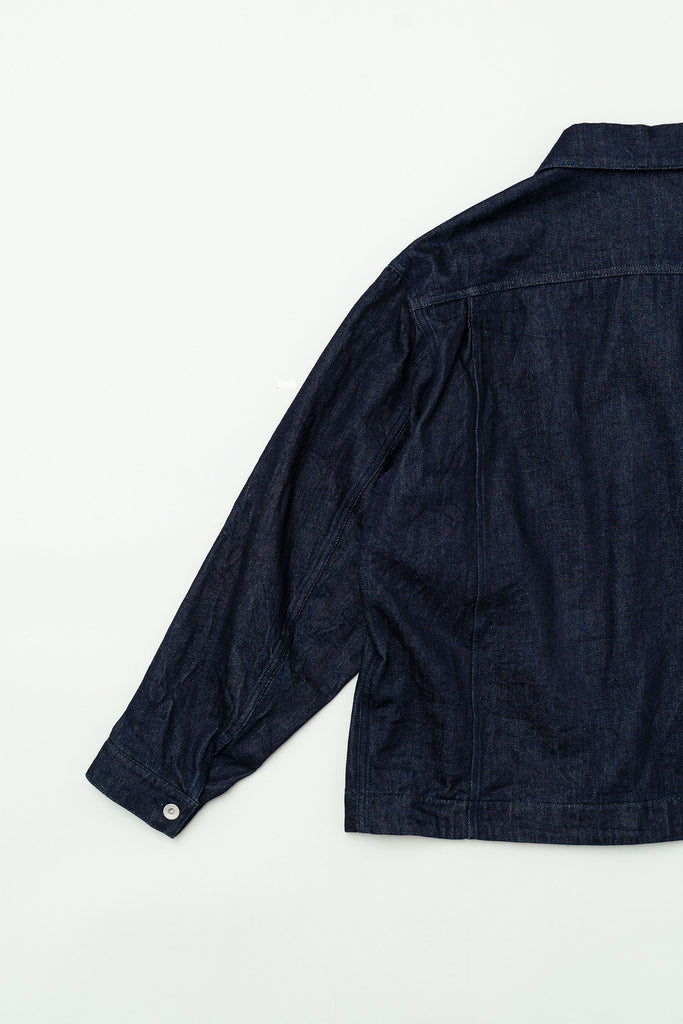デニムブルゾンですがいわゆるGジャン的な印象にせず、前身頃の切り替えを無くすことでシンプルな見た目に仕上げています。