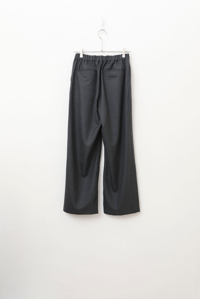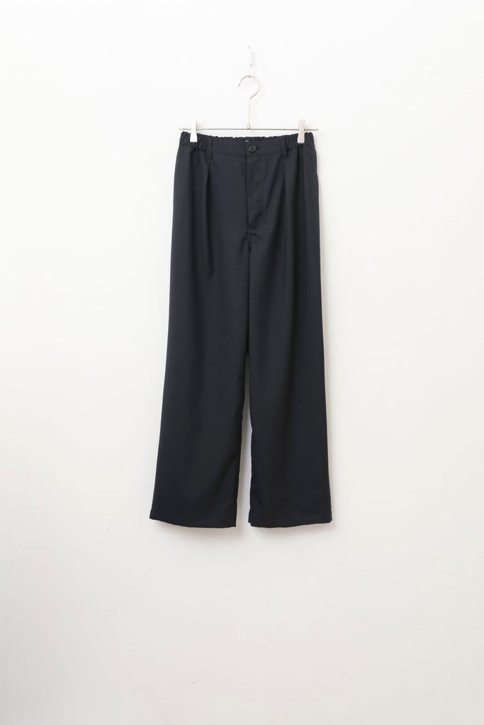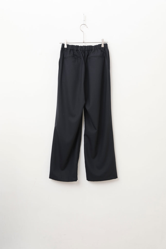 高級素材でいかにも綺麗なスラックスになりそうな生地ですが、ウエストには平ゴムを入れてイージーパンツのデザインにしています。