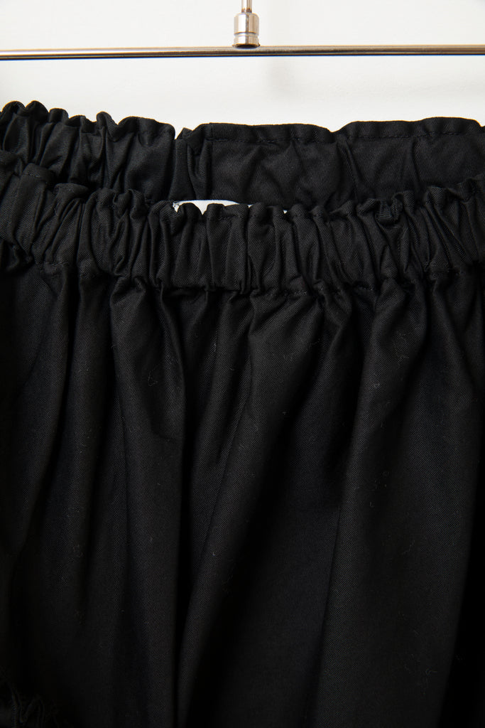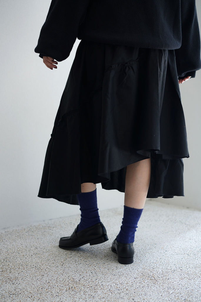 ギャザースカートとプリーツスカートが複雑にドッキングしたようなデザイン。正面が決まっていないため、コーデネートに合わせて向きを変え、シルエットや丈を調節することができます。