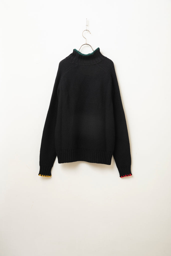 ざっくりとした柔らかいニットでとても着心地が良いです。タートルネックの襟元と袖口にはそれぞれ別の色糸が編まれており、インナーとして着用したときに、ちょうどアウターからこれらのアクセントカラーが覗くデザインとなっております。