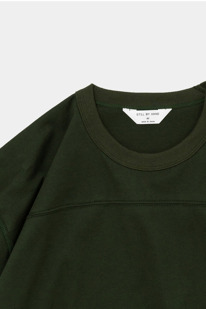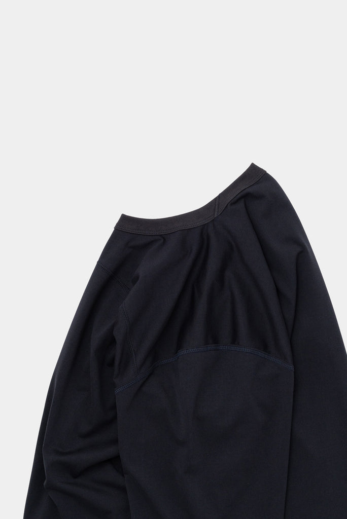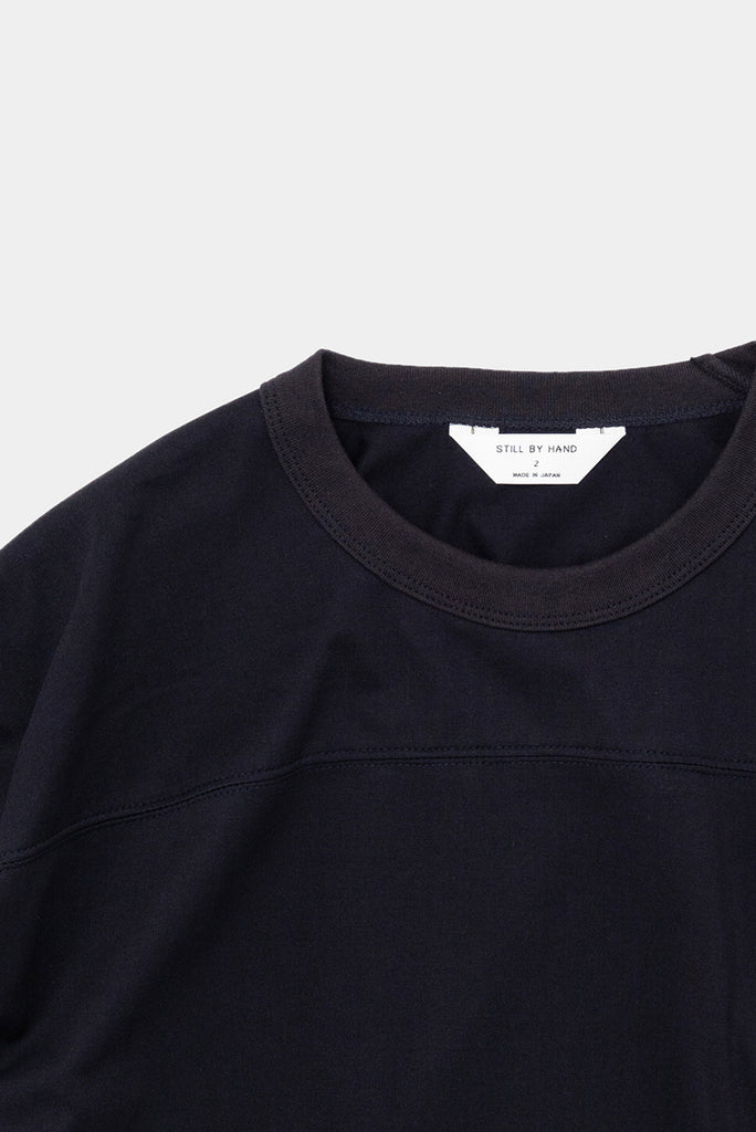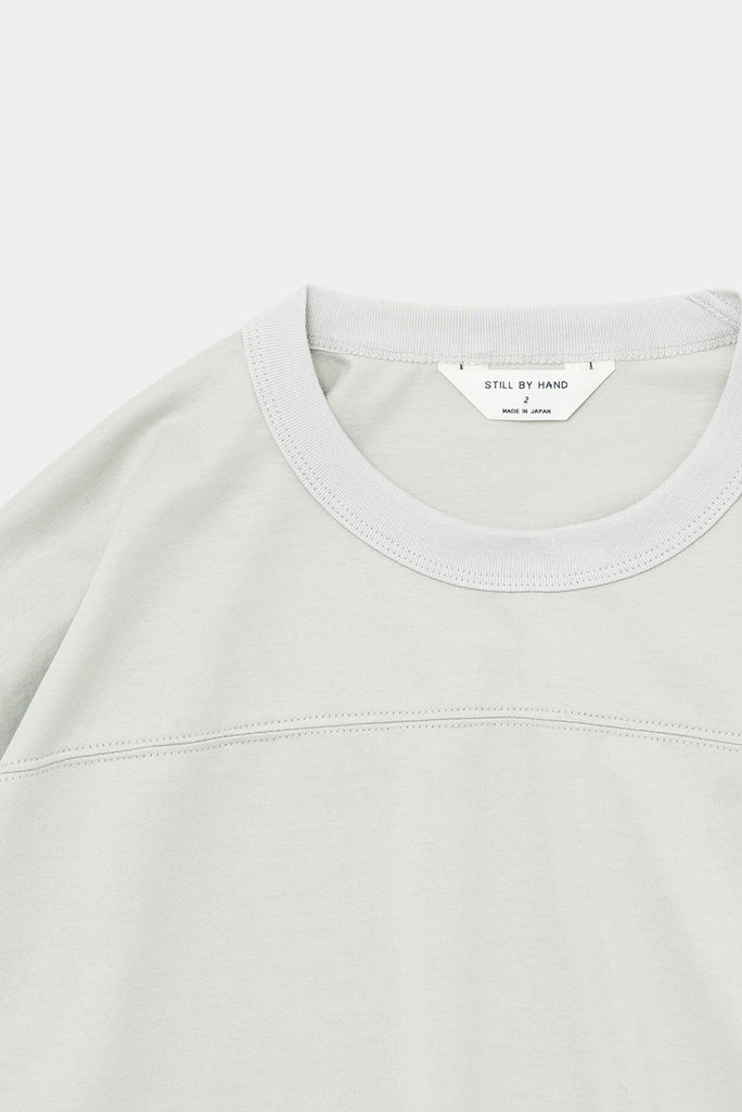 毛羽の少ないコンパクト糸を使用したロングスリーブカットソー。フットボールTシャツのような切り替えがポイントです。