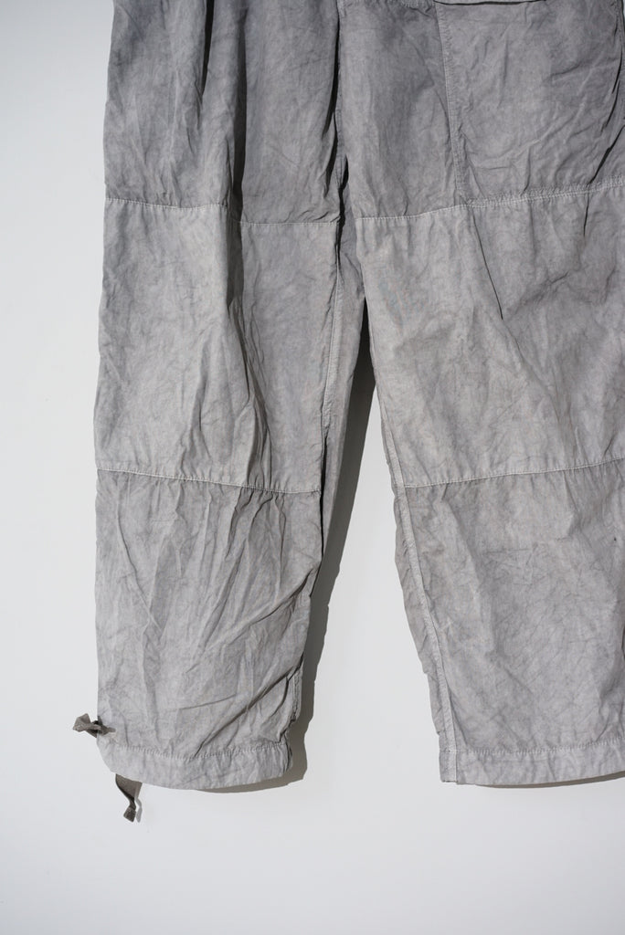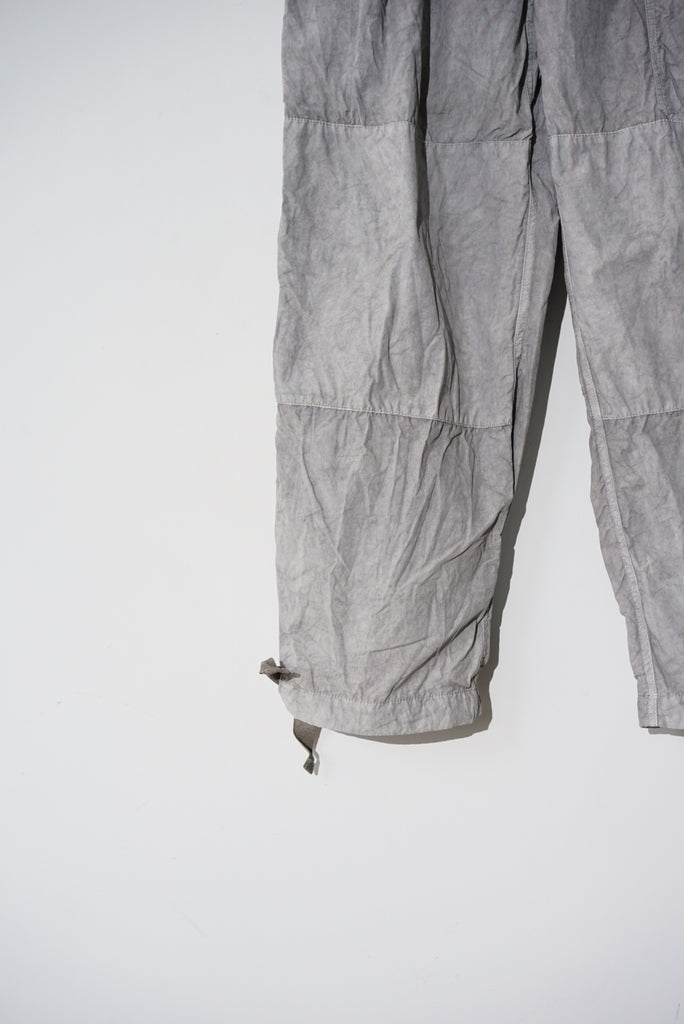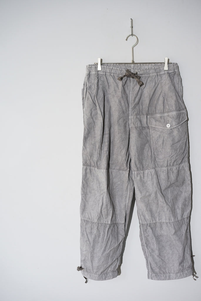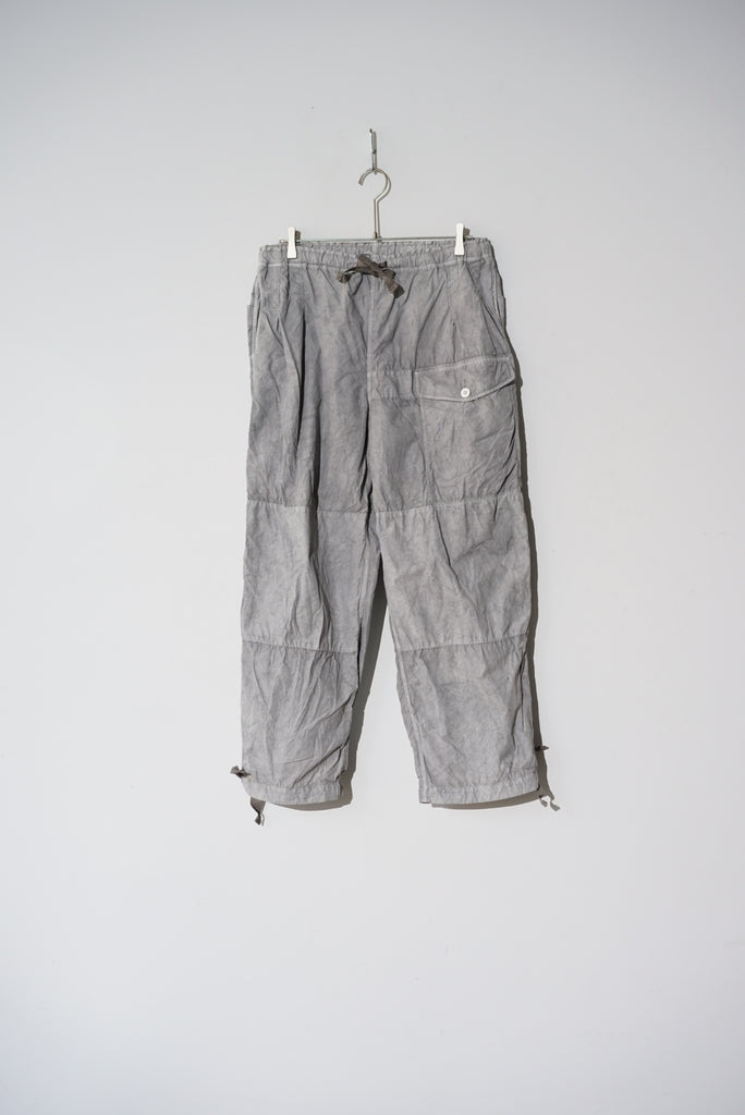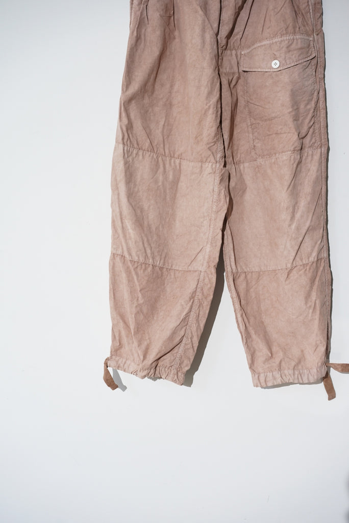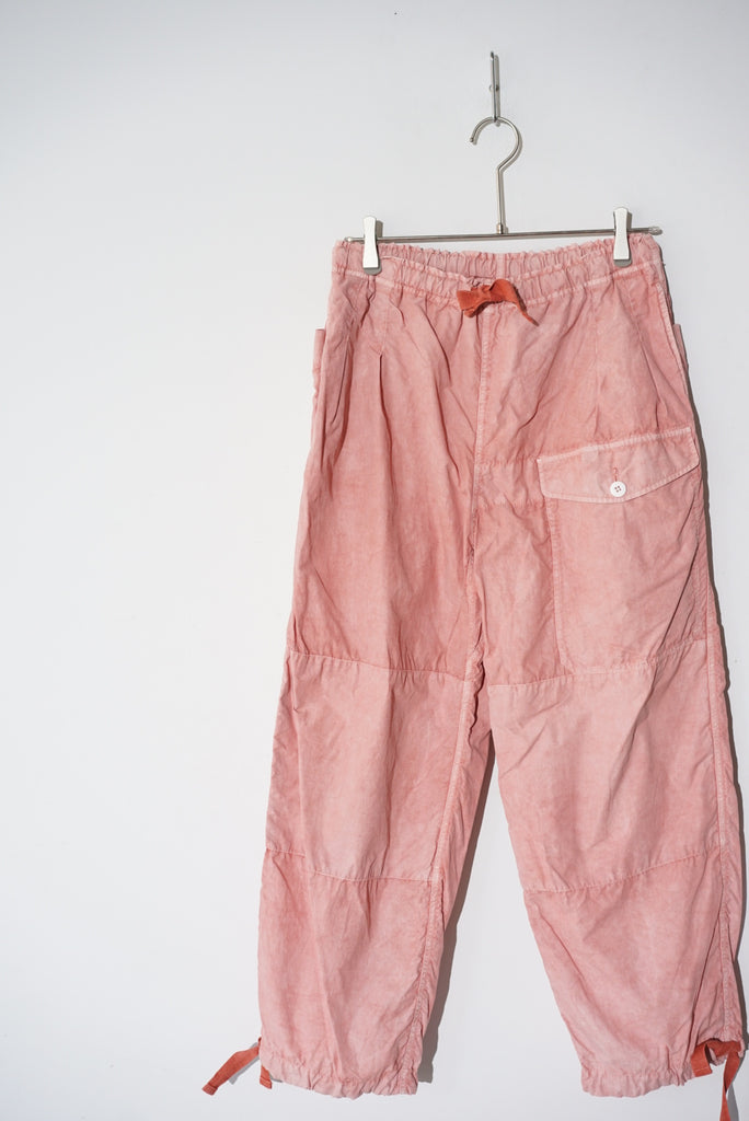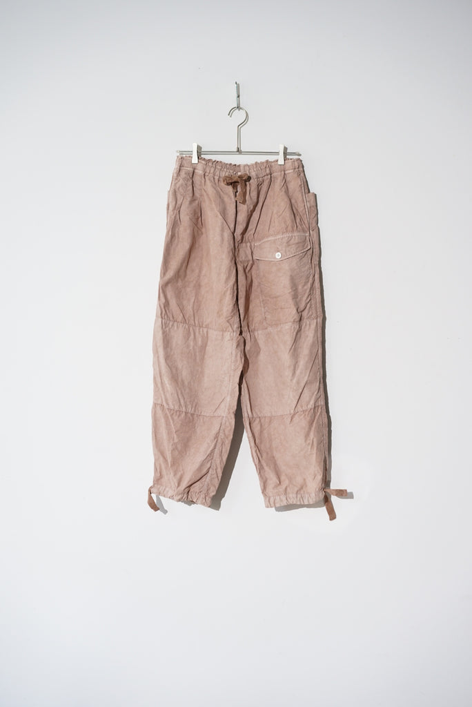 40'sのBRITISH ARMYのSAS OVER TROUSERのデザインから着想を得てデザインしたオーバーパンツ。単調なパターンとウエストのすわりの悪い箇所をチューニング。ウエストは2タックを入れ、腰回りの分量感はキープしつつ、平ゴムを入れることですわりを良くしています。素材は綿ナイロンの高密度に織られたウェザークロスを採用、綿とナイロンの染料の染め足のの違いにより、奥行きのある色目を表現。染めの手法は岡山県高梁市で銅の鉱山の副産物として使用されている土中の鉄が酸化した顔料を使用したベンガラ染にて1点1点職人さんの手染めによりムラ感を出しています。