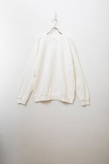 立体感のある胸元のプリントと、製品染を通じたほどよいフェード感のあるスウェットになります。比較的暖かい時期は一枚でコーディネートの主役としての使用を、本格的に秋冬が到来してからはアウターの下に着て差し色的に使っていただくのもオススメです。