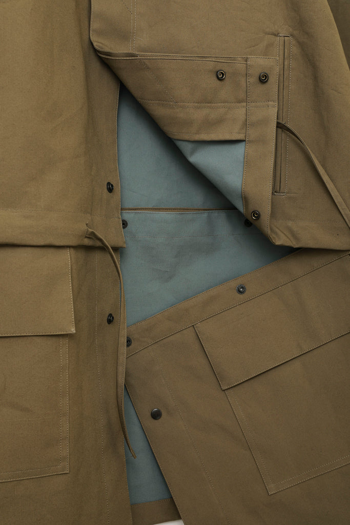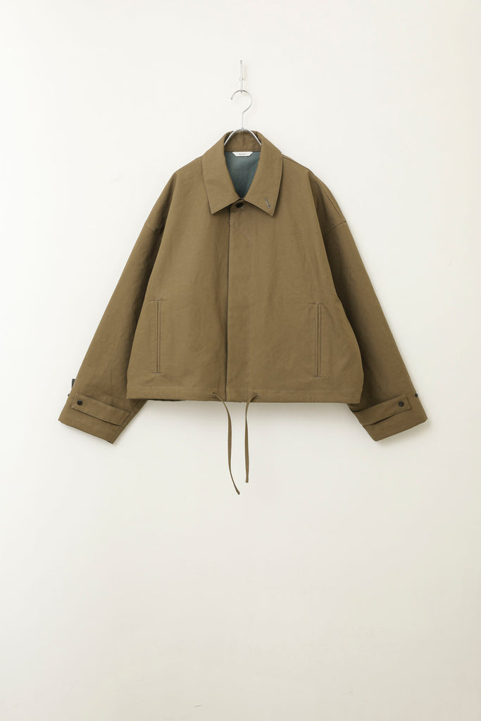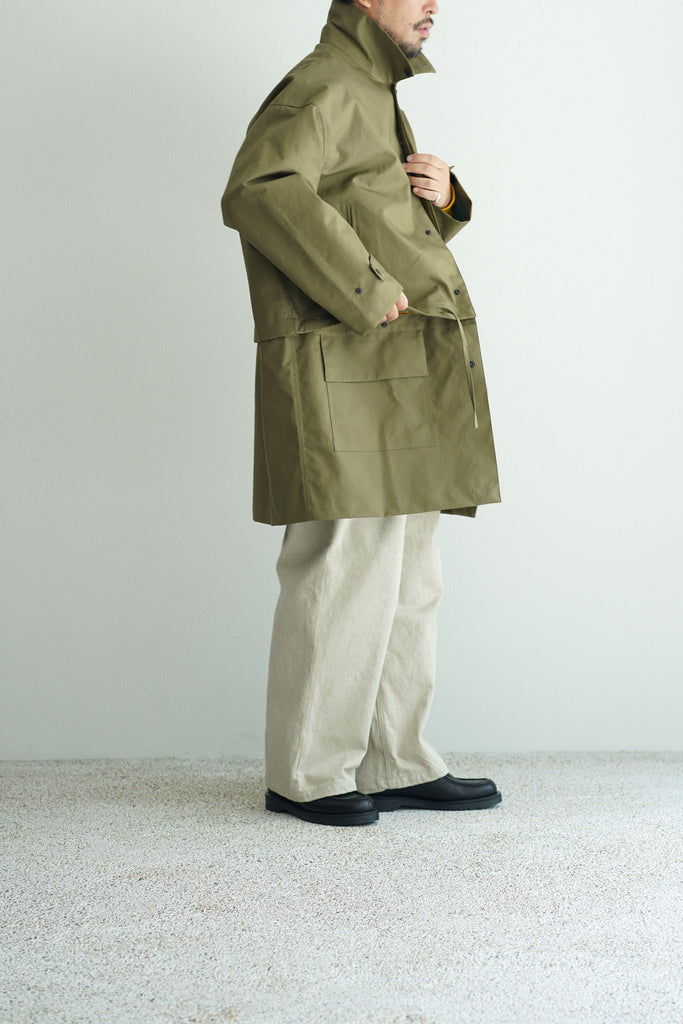 ムラ感が少ないコットンタイプライターに機能性フィルム(防風・透湿)を生地の間に貼ることで、綿素材ですが機能性を持った、テック感のある特徴的な素材に仕上げました。