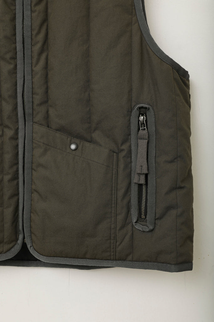 縦キルティングステッチを採用したベストは、随所にバインダーテープを施したデザインが特徴的で、秋季にはアウターとして、冬季にはアウターの内外どちらにも着用できる非常に利便性の高いアイテムです。