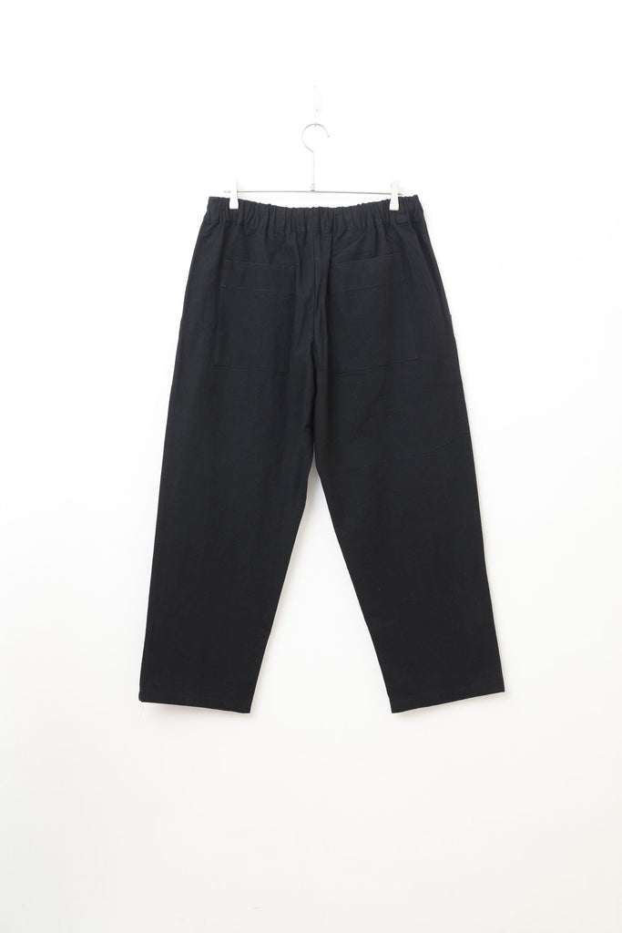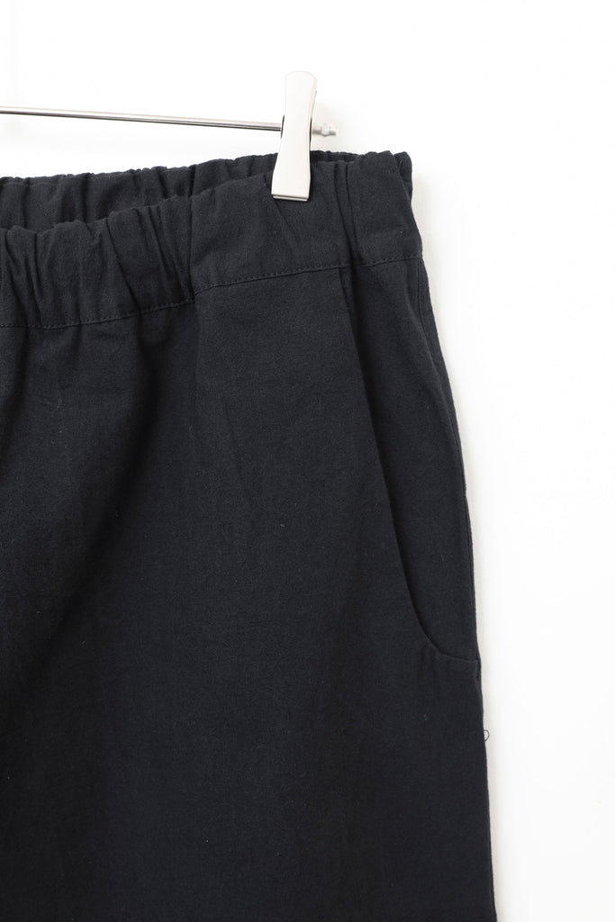 ゴムウエストのワイドパンツ。ゆったりとした股と脚が特徴で、足首に向かって細くなっています。前身頃のサイドシームポケットと後身頃のパッチポケットは内布で補強されています。ウエストはゴムで、ドローストリングが入っています。日本製。