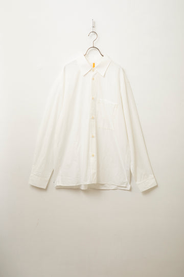ゆったりとしたストレートシルエットのシャツ。アームホールにゆとりを持たせ、シングルボタン留めのリラックスした袖。ハイスタンドカラー、ボタンフロント、左胸に大きなポケット付き。日本製。