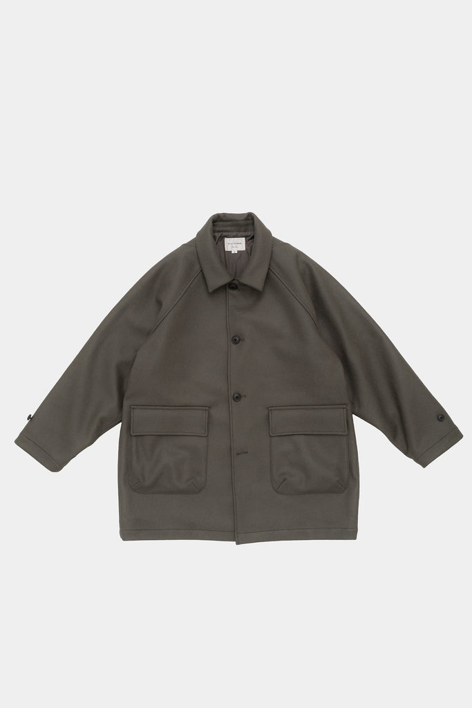 super110原料を使用した肉厚なメルトン素材のウールラグランコート。
