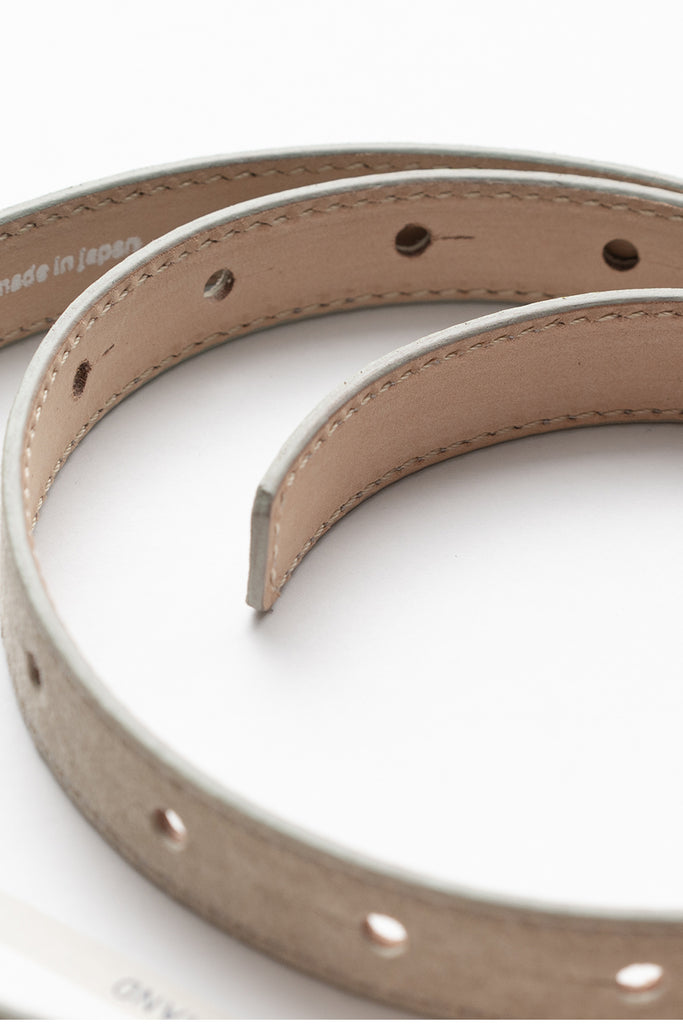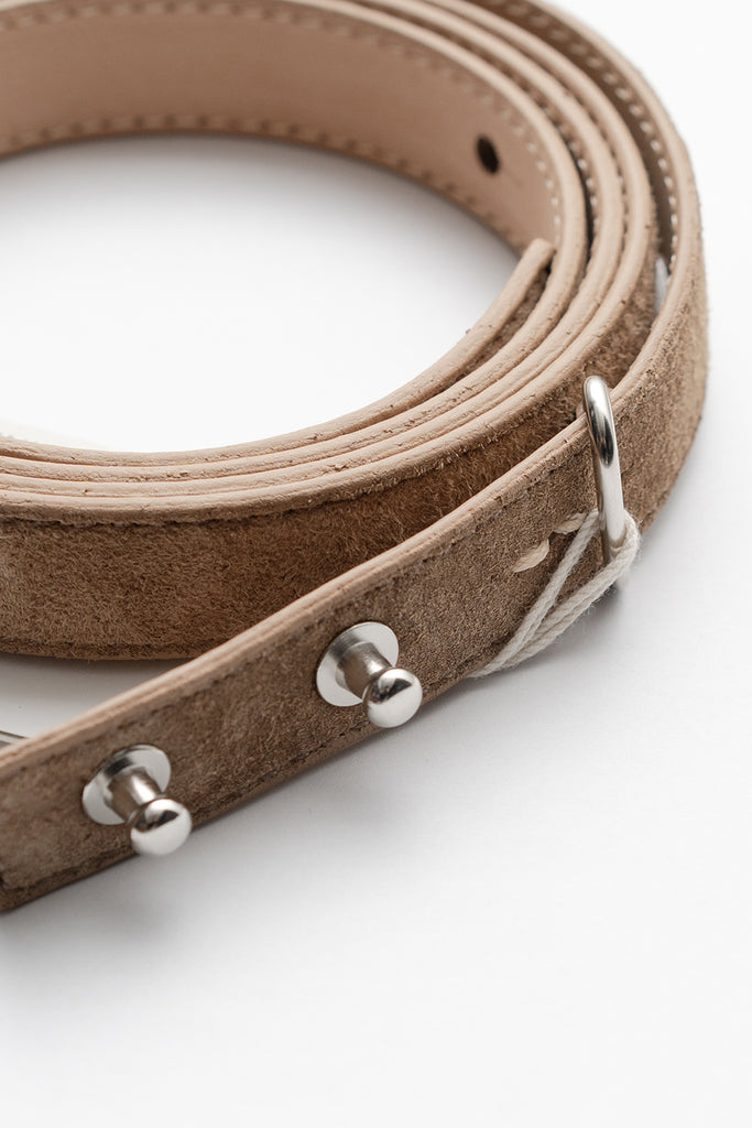 今シーズンのベルトはバックル無しでギボシでとめるタイプで剣先が長いタイプで作製。表側にはピッグスエード。裏側にはヌメの牛革を使用しました。