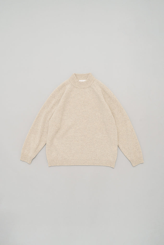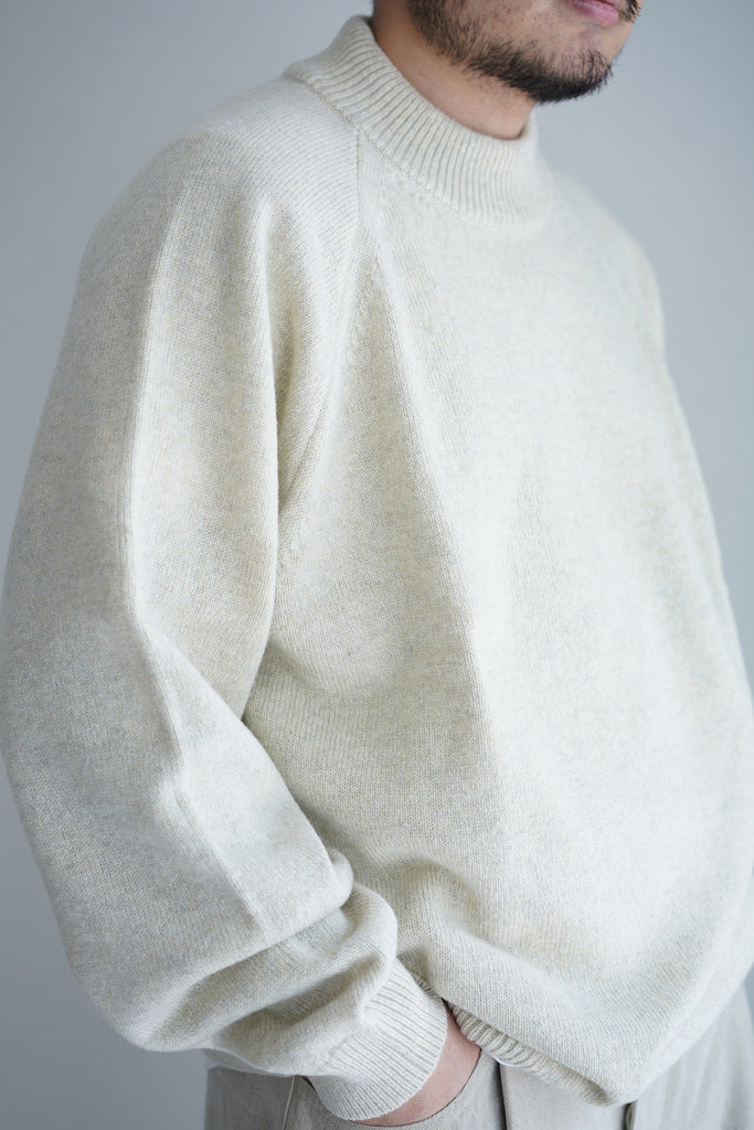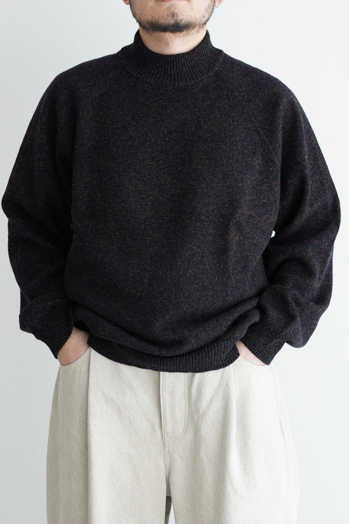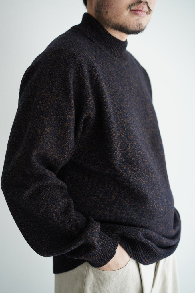 柔らかな風合いに拘って、繊維の細いウールを3本撚糸しミックス杢カラーのハイネックプルオーバーを作成しました。