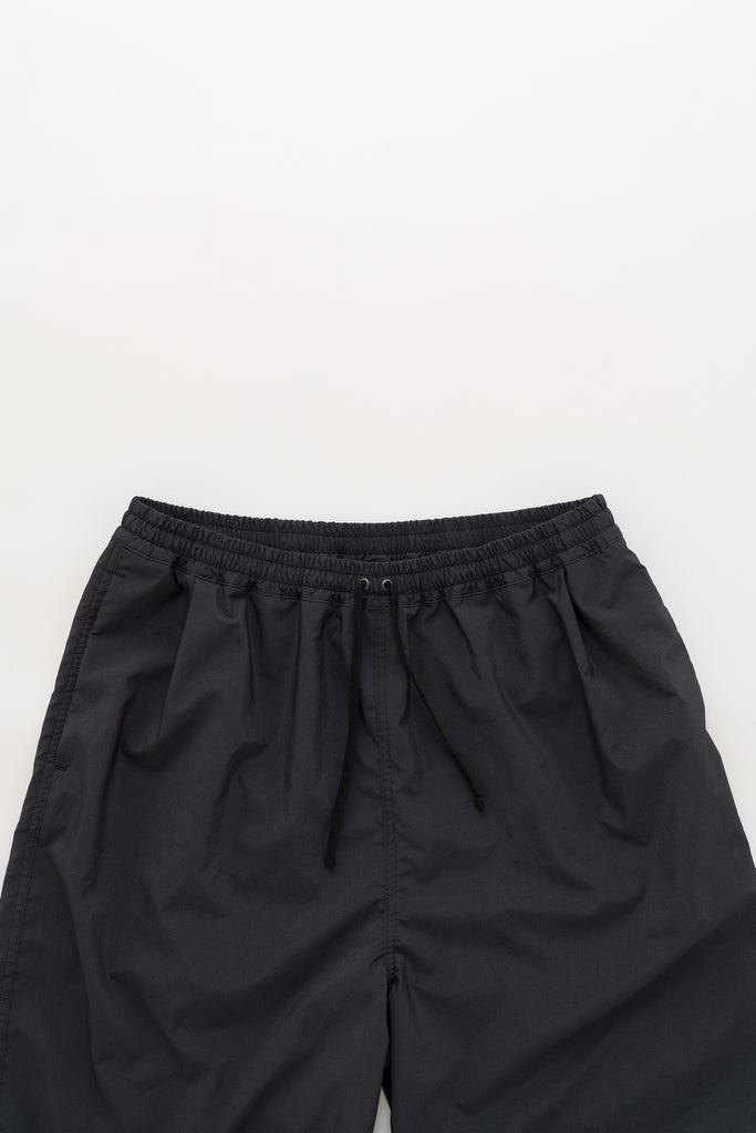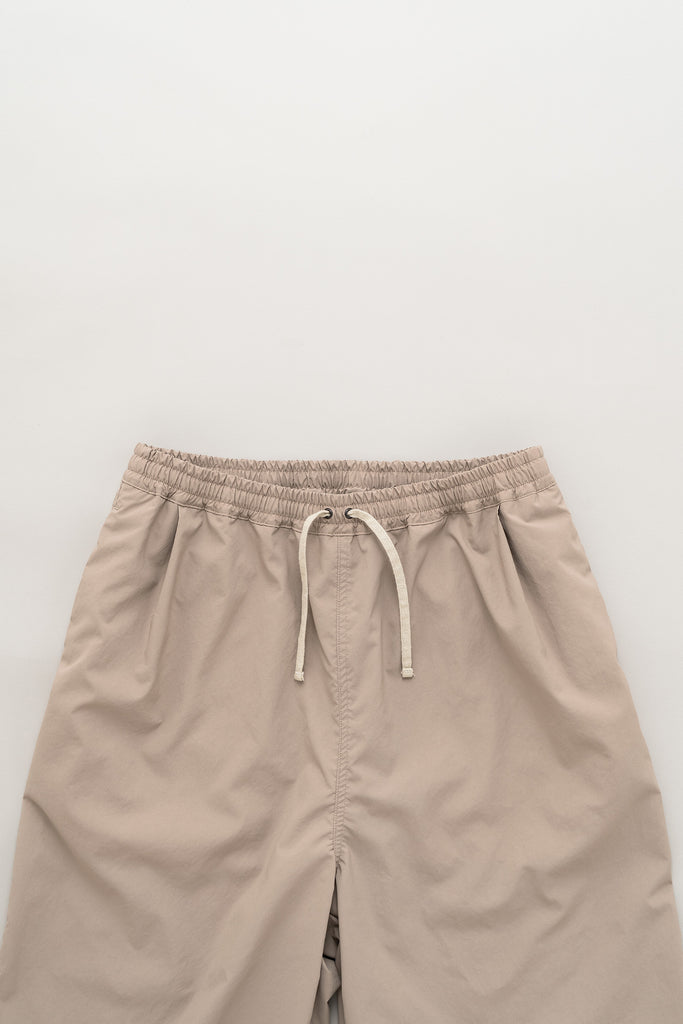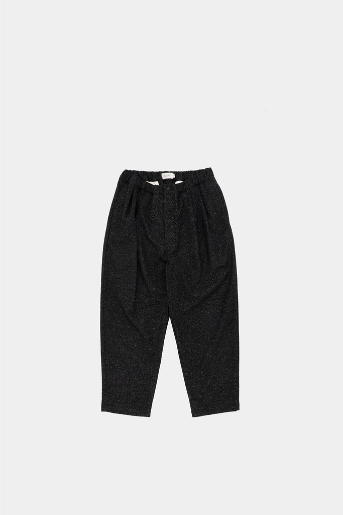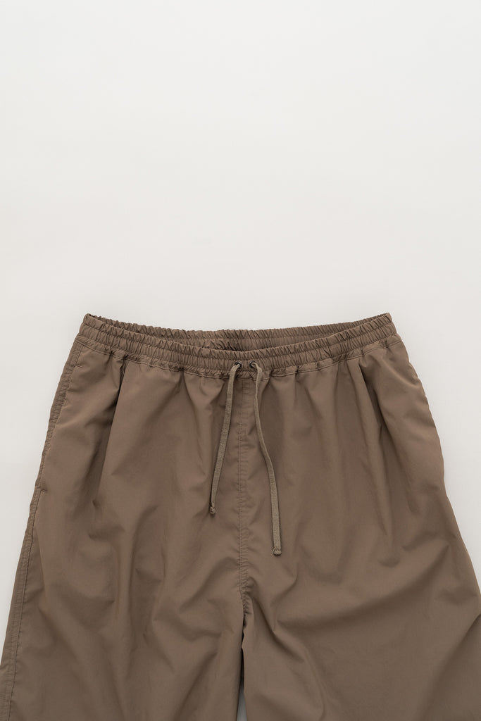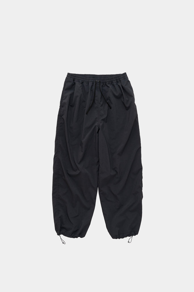 ポリエステルの織物でありながらナチュラルな洗いシワのある素材のワイドパンツ。