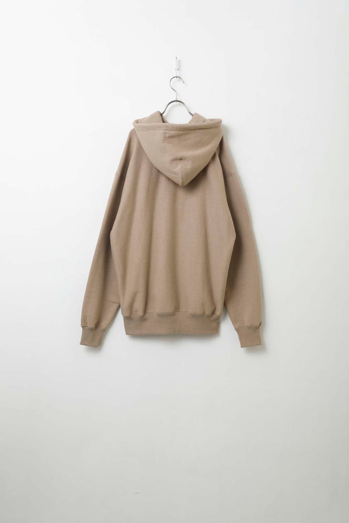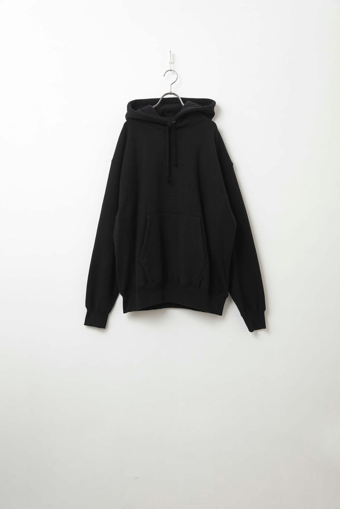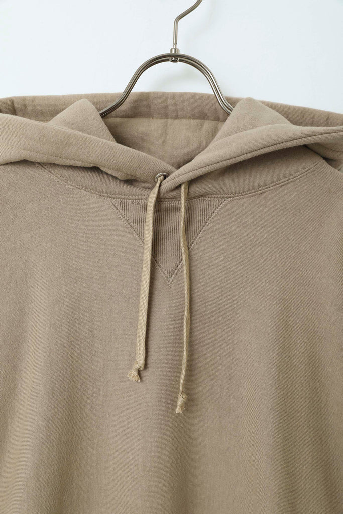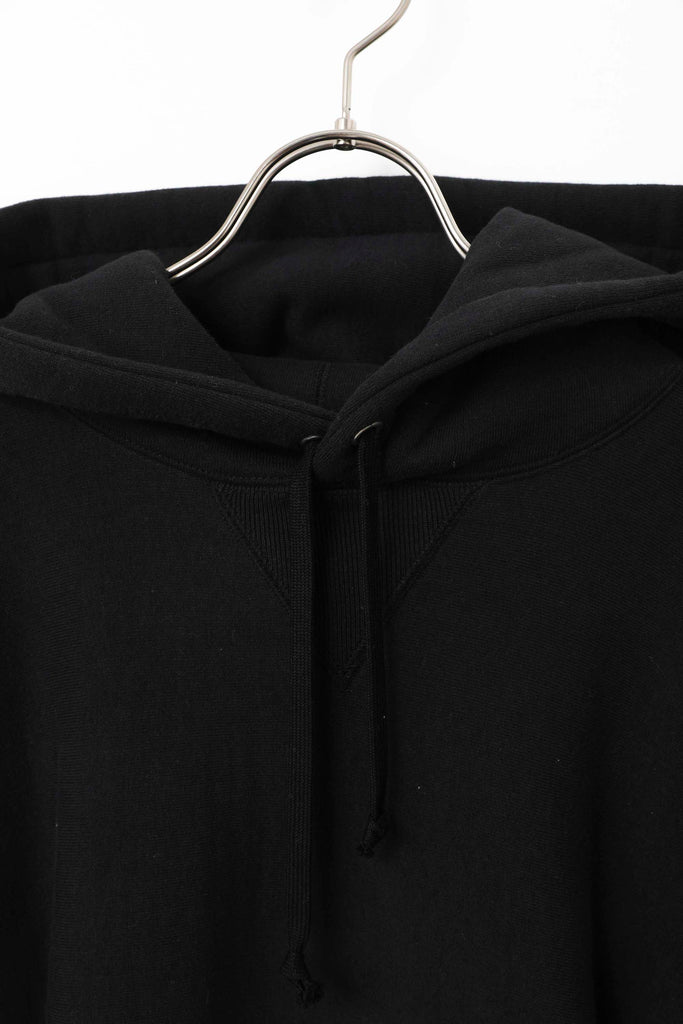 吊り編みで編み立てたブランドオリジナルの裏毛スウェット生地を使用したラグランフーディー。