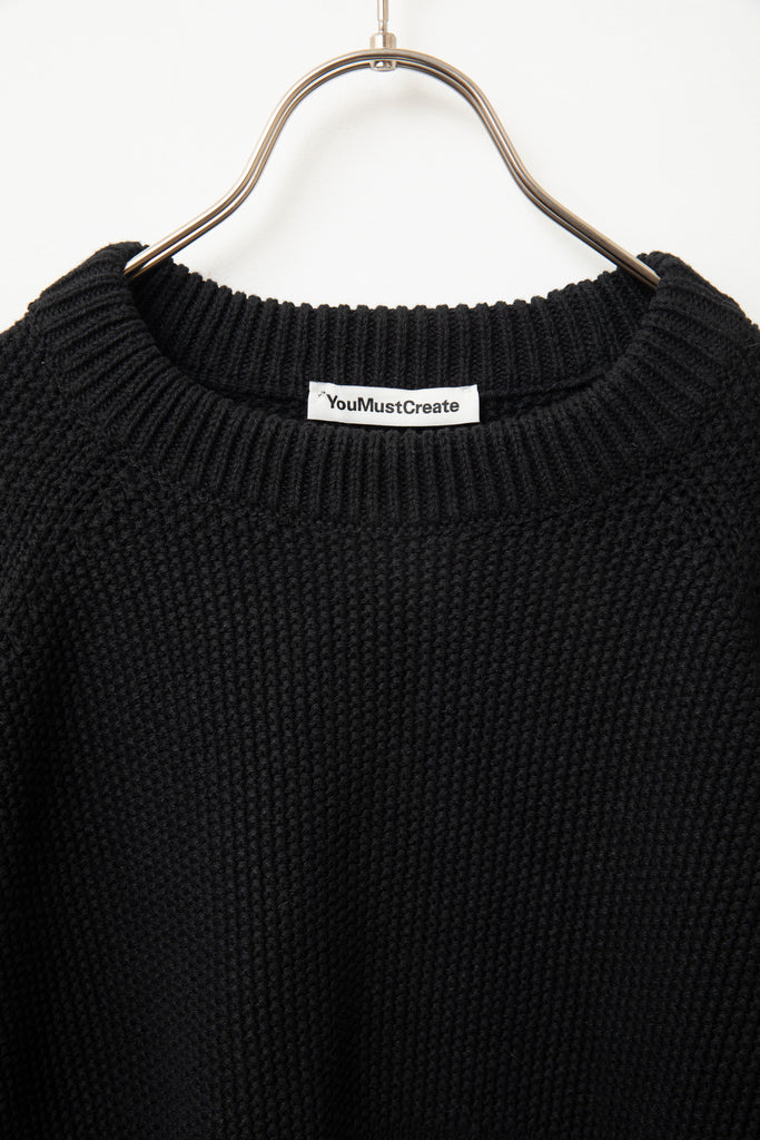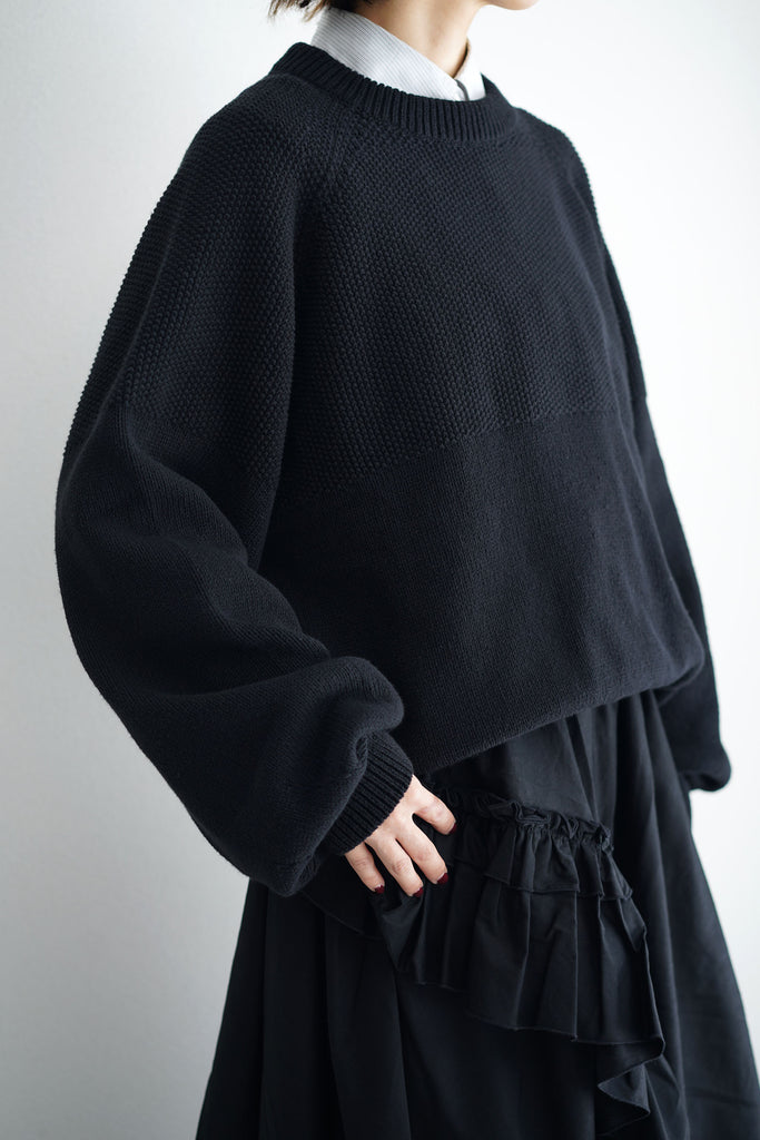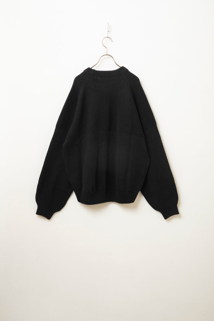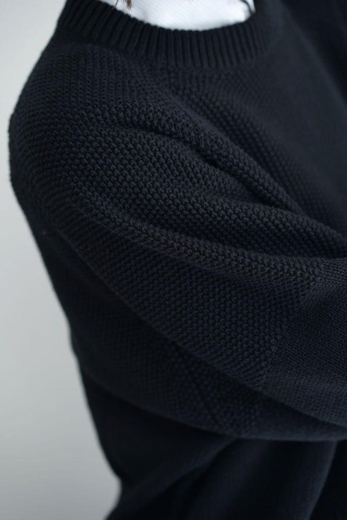 黒一色だと味気ないところを、上下で網目を変化させることで程よいアクセントになっています。ラグランスリーブでゆったりとした着心地のコットンニットです。